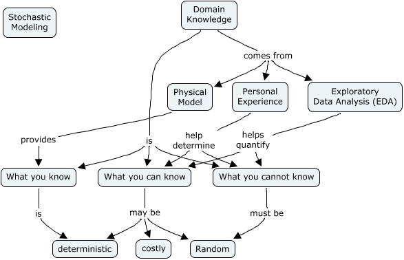 This Concept Map, created with IHMC CmapTools, has information related to: StochasticModeling, Exploratory Data Analysis (EDA) helps quantify What you cannot know, What you can know may be Random, Physical Model provides What you know, Domain Knowledge is What you cannot know, Personal Experience help determine What you can know, Domain Knowledge comes from Physical Model, Domain Knowledge is What you can know, Domain Knowledge is What you know, What you know is deterministic, Personal Experience help determine What you cannot know, Domain Knowledge comes from Exploratory Data Analysis (EDA), What you cannot know must be Random, What you can know may be deterministic, Domain Knowledge comes from Personal Experience, What you can know may be costly, Exploratory Data Analysis (EDA) helps quantify What you can know
