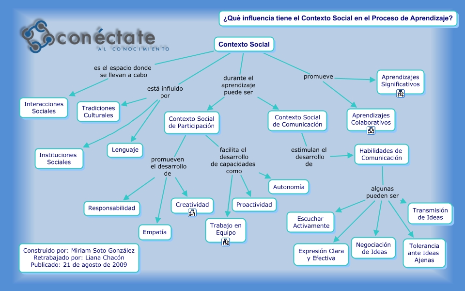 Este Cmap, tiene información relacionada con: Contexto Social del Aprendizaje, Contexto Social de Participación promueven el desarrollo de Empatía, Contexto Social de Participación facilita el desarrollo de capacidades como Autonomía, Contexto Social promueve Aprendizajes Significativos, Habilidades de Comunicación algunas pueden ser Tolerancia ante Ideas Ajenas, Contexto Social de Comunicación estimulan el desarrollo de Habilidades de Comunicación, Contexto Social de Participación promueven el desarrollo de Responsabilidad, Contexto Social está influido por Tradiciones Culturales, Contexto Social está influido por Instituciones Sociales, Habilidades de Comunicación algunas pueden ser Negociación de Ideas, Contexto Social está influido por Lenguaje, Contexto Social de Participación promueven el desarrollo de Creatividad, Contexto Social de Participación facilita el desarrollo de capacidades como Trabajo en Equipo, Contexto Social durante el aprendizaje puede ser Contexto Social de Comunicación, Habilidades de Comunicación algunas pueden ser Escuchar Activamente, Habilidades de Comunicación algunas pueden ser Transmisión de Ideas, Contexto Social promueve Aprendizajes Colaborativos, Contexto Social es el espacio donde se llevan a cabo Interacciones Sociales, Contexto Social de Participación facilita el desarrollo de capacidades como Proactividad, Contexto Social durante el aprendizaje puede ser Contexto Social de Participación, Habilidades de Comunicación algunas pueden ser Expresión Clara y Efectiva