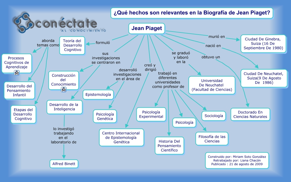 Este Cmap, tiene información relacionada con: Jean Piaget, Jean Piaget desarrolló investigaciones en el área de Psicología Genética, Teoría del Desarrollo Cognitivo aborda temas como Desarrollo del Pensamiento Infantil, Jean Piaget nació en Ciudad De Neuchatel, Suiza(9 De Agosto De 1986), Jean Piaget trabajó en diferentes universidades como profesor de Filosofía de las Ciencias, Jean Piaget sus investigaciones se centraron en Desarrollo de la Inteligencia, Teoría del Desarrollo Cognitivo aborda temas como Procesos Cognitivos de Aprendizaje, Jean Piaget se graduó y laboró en la Universidad De Neuchatel (Facultad de Ciencias), Desarrollo de la Inteligencia lo investigó trabajando en el laboratorio de Alfred Binett, Jean Piaget creó y dirigió Centro Internacional de Epistemología Genética, Jean Piaget desarrolló investigaciones en el área de Epistemología, Jean Piaget trabajó en diferentes universidades como profesor de Sociología, Jean Piaget sus investigaciones se centraron en Construcción del Conocimiento, Jean Piaget formuló Teoría del Desarrollo Cognitivo, Jean Piaget trabajó en diferentes universidades como profesor de Psicología Experimental, Jean Piaget obtuvo un Doctorado En Ciencias Naturales, Jean Piaget murió en Ciudad De Ginebra, Suiza (16 De Septiembre De 1980), Teoría del Desarrollo Cognitivo aborda temas como Etapas del Desarrollo Cognitivo, Jean Piaget trabajó en diferentes universidades como profesor de Psicología, Jean Piaget trabajó en diferentes universidades como profesor de Historia Del Pensamiento Científico