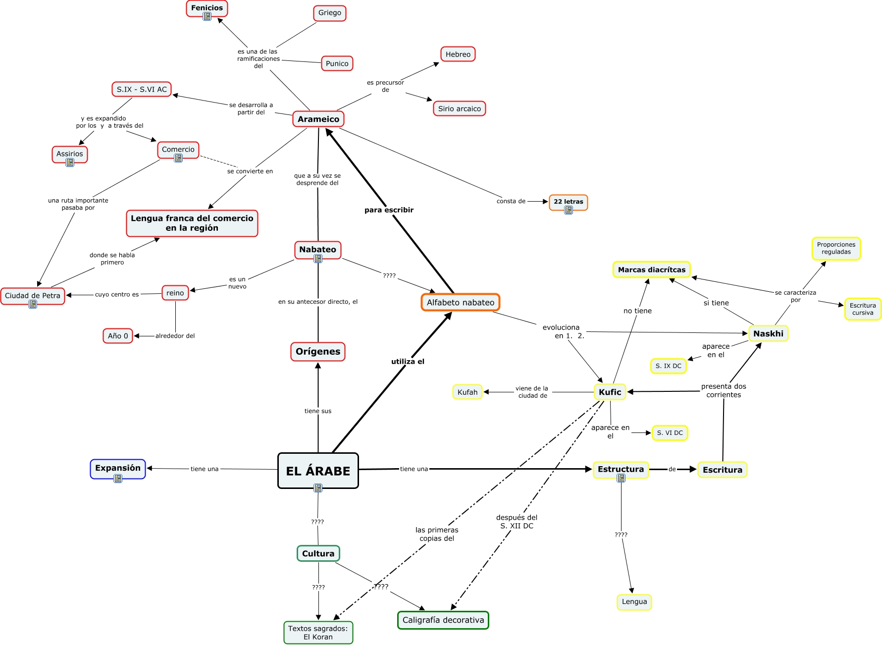 This Concept Map, created with IHMC CmapTools, has information related to: MapaArabe, Alfabeto nabateo evoluciona en 1. 2. Kufic, Arameico es precursor de Hebreo, Arameico es una de las ramificaciones del Fenicios, Kufic después del S. XII DC Caligrafía decorativa, Comercio una ruta importante pasaba por Ciudad de Petra, Naskhi aparece en el S. IX DC, Estructura ???? Lengua, EL ÁRABE ???? Cultura, Naskhi se caracteriza por Escritura cursiva, Naskhi se caracteriza por Proporciones reguladas, Kufic las primeras copias del Textos sagrados: El Koran, EL ÁRABE tiene una Estructura, Alfabeto nabateo para escribir Arameico, Arameico es precursor de Sirio arcaico, reino alrededor del Año 0, Arameico se desarrolla a partir del S.IX - S.VI AC, Alfabeto nabateo evoluciona en 1. 2. Naskhi, reino cuyo centro es Ciudad de Petra, Escritura presenta dos corrientes Naskhi, Kufic viene de la ciudad de Kufah