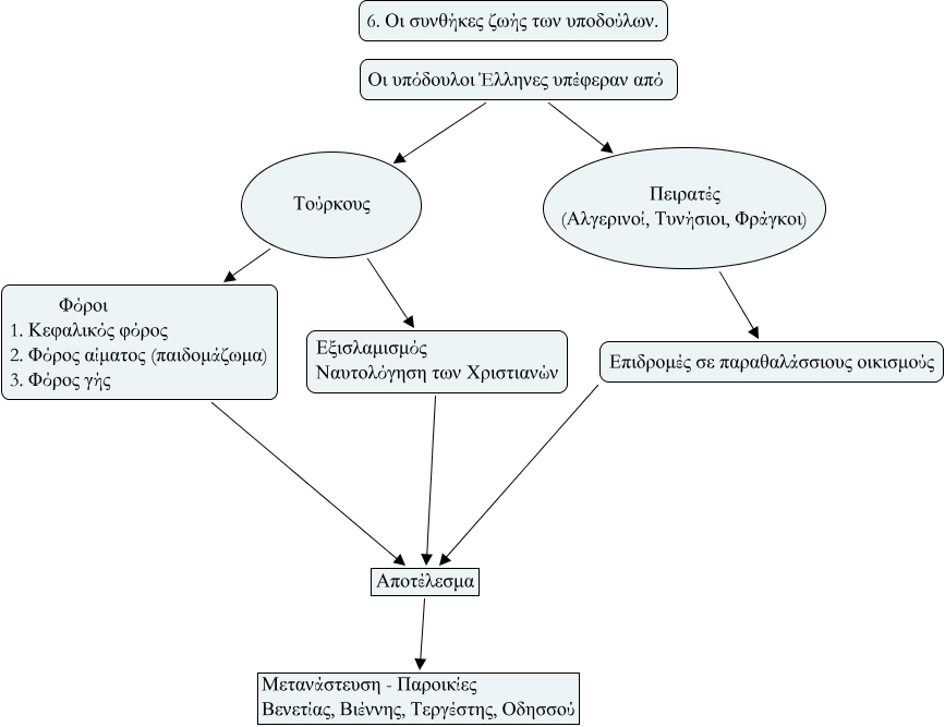 This Concept Map, created with IHMC CmapTools, has information related to: 6 ΟΙ ΣΥΝΘΗΚΕΣ ΖΩΗΣ ΤΩΝ ΥΠΟΔΟΥΛΩΝ, Οι υπόδουλοι Έλληνες υπέφεραν από Τούρκους, Τούρκους Φόροι 1. Κεφαλικός φόρος 2. Φόρος αίματος (παιδομάζωμα) 3. Φόρος γής, Εξισλαμισμός Ναυτολόγηση των Χριστιανών Αποτέλεσμα, Επιδρομές σε παραθαλάσσιους οικισμούς Αποτέλεσμα, Φόροι 1. Κεφαλικός φόρος 2. Φόρος αίματος (παιδομάζωμα) 3. Φόρος γής Αποτέλεσμα, Πειρατές (Αλγερινοί, Τυνήσιοι, Φράγκοι) Επιδρομές σε παραθαλάσσιους οικισμούς, Οι υπόδουλοι Έλληνες υπέφεραν από Πειρατές (Αλγερινοί, Τυνήσιοι, Φράγκοι), Τούρκους Εξισλαμισμός Ναυτολόγηση των Χριστιανών, Αποτέλεσμα Μετανάστευση - Παροικίες Βενετίας, Βιέννης, Τεργέστης, Οδησσού