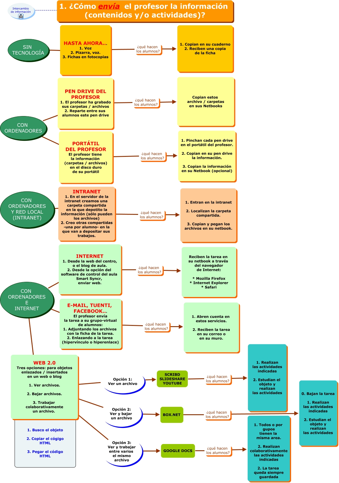 Este Cmap, tiene información relacionada con: enviar, CON ORDENADORES Y RED LOCAL (INTRANET) ???? INTRANET 1. En el servidor de la intranet creamos una carpeta compartida en la que depotito la información (sólo pueden los archivos) 2. Creo otras compartidas -una por alumno- en la que van a depositar sus trabajos., HASTA AHORA... 1. Voz 2. Pizarra, voz. 3. Fichas en fotocopias ¿qué hacen los alumnos? 1. Copian en su cuaderno 2. Reciben una copia de la ficha, Intercambio de información ???? 1. ¿Cómo envía el profesor la información (contenidos y/o actividades)?, SCRIBD SLIDESHARE YOUTUBE ¿qué hacen los alumnos? 1. Realizan las actividades indicadas 2. Estudian el objeto y realizan las actividades, INTERNET 1. Desde la web del centro, o el blog de aula. 2. Desde la opción del software de control del aula Smart Syncr, enviar web. ¿qué hacen los alumnos? Reciben la tarea en su netbook a través del navegador de Internet: * Mozilla Firefox * Internet Explorer * Safari, WEB 2.0 Tres opciones: para objetos enlazados / insertados en un web o blog 1. Ver archivos. 2. Bajar archivos. 3. Trabajar colaborativamente un archivo. Opción 2: Ver y bajar un archivo BOX.NET, WEB 2.0 Tres opciones: para objetos enlazados / insertados en un web o blog 1. Ver archivos. 2. Bajar archivos. 3. Trabajar colaborativamente un archivo. Opción 1: Ver un archivo SCRIBD SLIDESHARE YOUTUBE, INTRANET 1. En el servidor de la intranet creamos una carpeta compartida en la que depotito la información (sólo pueden los archivos) 2. Creo otras compartidas -una por alumno- en la que van a depositar sus trabajos. ¿qué hacen los alumnos? 1. Entran en la intranet 2. Localizan la carpeta compartida. 3. Copian y pegan los archivos en su netbook., CON ORDENADORES ???? PORTÁTIL DEL PROFESOR El profesor tiene la información (carpetas / archivos) en el disco duro de su portátil, CON ORDENADORES E INTERNET ???? INTERNET 1. Desde la web del centro, o el blog de aula. 2. Desde la opción del software de control del aula Smart Syncr, enviar web., WEB 2.0 Tres opciones: para objetos enlazados / insertados en un web o blog 1. Ver archivos. 2. Bajar archivos. 3. Trabajar colaborativamente un archivo. Opción 3: Ver y trabajar entre varios el mismo archivo GOOGLE DOCS, PORTÁTIL DEL PROFESOR El profesor tiene la información (carpetas / archivos) en el disco duro de su portátil ¿qué hacen los alumnos? 1. Pinchan cada pen drive en el portátil del profesor. 2. Copian en su pen drive la información. 3. Copian la información en su Netbook (opcional), SIN TECNOLOGÍA ???? HASTA AHORA... 1. Voz 2. Pizarra, voz. 3. Fichas en fotocopias, E-MAIL, TUENTI, FACEBOOK... El profesor envía la tarea a su grupo-virtual de alumnos: 1. Adjuntando los archivos con la ficha de la tarea. 2. Enlazando a la tarea (hipervínculo o hiperenlace) ¿qué hacen los alumnos? 1. Abren cuenta en estos servicios. 2. Reciben la tarea en su correo o en su muro., CON ORDENADORES ???? PEN DRIVE DEL PROFESOR 1. El profesor ha grabado sus carpetas / archivos 2. Reparte entre sus alumnos este pen drive, GOOGLE DOCS ¿qué hacen los alumnos? 1. Todos o por gupos tienen la misma area. 2. Realizan colaborativamente las actividades indicadas 2. La tarea queda siempre guardada, CON ORDENADORES E INTERNET ???? E-MAIL, TUENTI, FACEBOOK... El profesor envía la tarea a su grupo-virtual de alumnos: 1. Adjuntando los archivos con la ficha de la tarea. 2. Enlazando a la tarea (hipervínculo o hiperenlace), PEN DRIVE DEL PROFESOR 1. El profesor ha grabado sus carpetas / archivos 2. Reparte entre sus alumnos este pen drive ¿qué hacen los alumnos? Copian estos archivo / carpetas en sus Netbooks, BOX.NET ¿qué hacen los alumnos? 0. Bajan la tarea 1. Realizan las actividades indicadas 2. Estudian el objeto y realizan las actividades, CON ORDENADORES E INTERNET ???? WEB 2.0 Tres opciones: para objetos enlazados / insertados en un web o blog 1. Ver archivos. 2. Bajar archivos. 3. Trabajar colaborativamente un archivo.