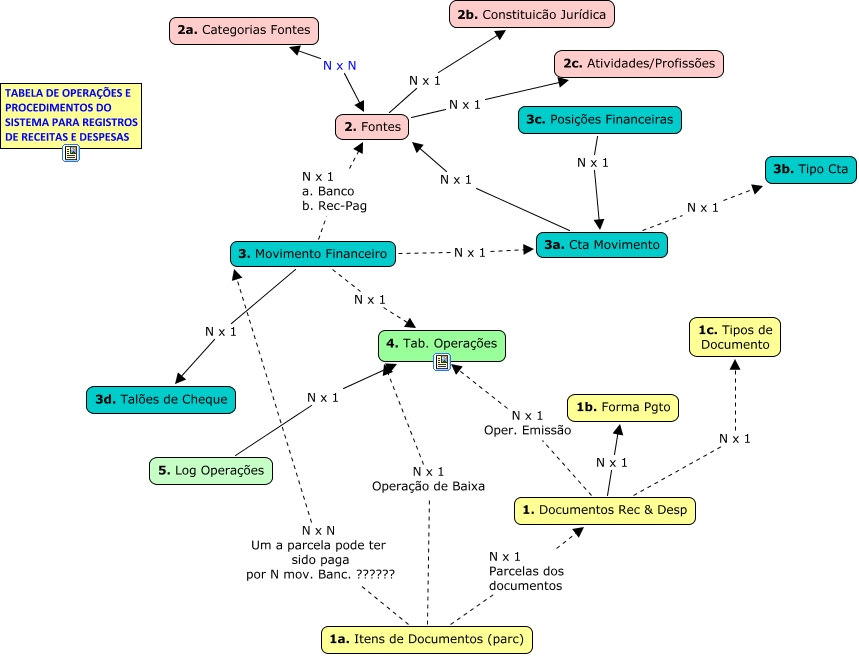 Esse mapa conceitual, produzido no IHMC CmapTools, tem a informação relacionada a: Sistema Financeiro- Estruturas de Dados V 3.0, 3. Movimento Financeiro N x 1 3a. Cta Movimento, 3a. Cta Movimento N x 1 3b. Tipo Cta, 3. Movimento Financeiro N x 1 a. Banco b. Rec-Pag 2. Fontes, 3. Movimento Financeiro N x 1 4. Tab. Operações, 1a. Itens de Documentos (parc) N x N Um a parcela pode ter sido paga por N mov. Banc. ?????? 3. Movimento Financeiro, 1. Documentos Rec & Desp N x 1 Oper. Emissão 4. Tab. Operações, 2. Fontes N x 1 2b. Constituicão Jurídica, 3. Movimento Financeiro N x 1 3d. Talões de Cheque, 1. Documentos Rec & Desp N x 1 1c. Tipos de Documento, 3a. Cta Movimento N x 1 2. Fontes, 1. Documentos Rec & Desp N x 1 1b. Forma Pgto, 1a. Itens de Documentos (parc) N x 1 Operação de Baixa 4. Tab. Operações, 2. Fontes N x 1 2c. Atividades/Profissões, 3c. Posições Financeiras N x 1 3a. Cta Movimento, 1a. Itens de Documentos (parc) N x 1 Parcelas dos documentos 1. Documentos Rec & Desp