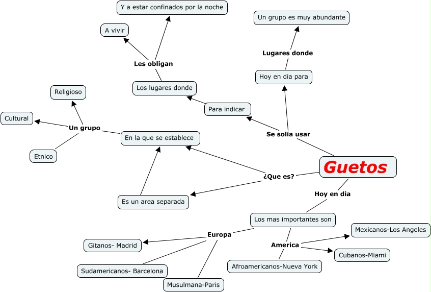 Este Cmap, tiene información relacionada con: Guetos, En la que se establece Un grupo Religioso, Los lugares donde Les obligan Y a estar confinados por la noche, Guetos ¿Que es? En la que se establece, Para indicar ???? Los lugares donde, Guetos ¿Que es? Es un area separada, Los mas importantes son America Afroamericanos-Nueva York, Los mas importantes son America Mexicanos-Los Angeles, Los mas importantes son Europa Musulmana-Paris, Los mas importantes son Europa Sudamericanos- Barcelona, Hoy en dia para Lugares donde Un grupo es muy abundante, Los mas importantes son America Cubanos-Miami, Guetos Se solia usar Hoy en dia para, Los mas importantes son Europa Gitanos- Madrid, En la que se establece Un grupo Cultural, Los lugares donde Les obligan A vivir, En la que se establece Un grupo Etnico, Guetos Hoy en dia Los mas importantes son, Es un area separada ???? En la que se establece, Guetos Se solia usar Para indicar