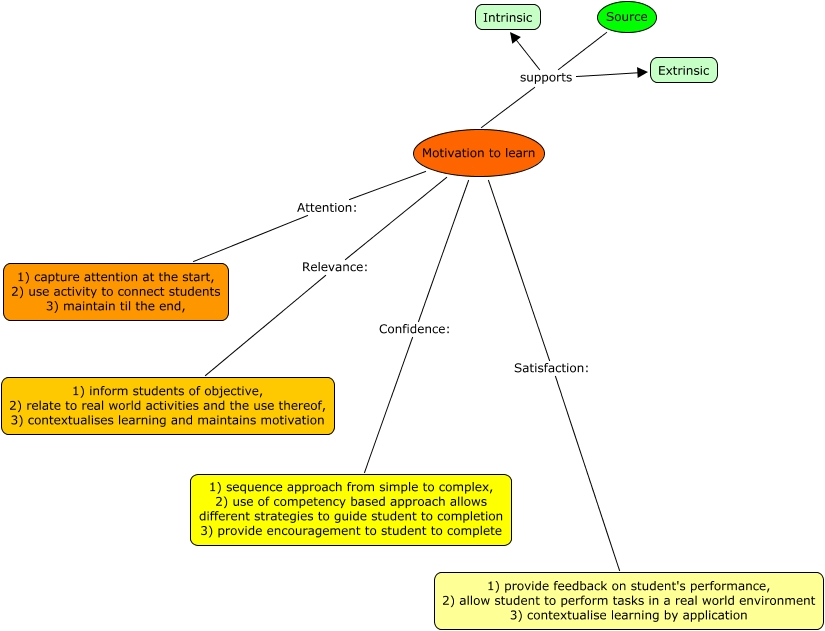 This Concept Map, created with IHMC CmapTools, has information related to: Motivation to learn, Motivation to learn Satisfaction: 1) provide feedback on student's performance, 2) allow student to perform tasks in a real world environment 3) contextualise learning by application, Motivation to learn Confidence: 1) sequence approach from simple to complex, 2) use of competency based approach allows different strategies to guide student to completion 3) provide encouragement to student to complete, Source supports Extrinsic, Motivation to learn Attention: 1) capture attention at the start, 2) use activity to connect students 3) maintain til the end,, Source supports Intrinsic, Motivation to learn Relevance: 1) inform students of objective, 2) relate to real world activities and the use thereof, 3) contextualises learning and maintains motivation, Source supports Motivation to learn