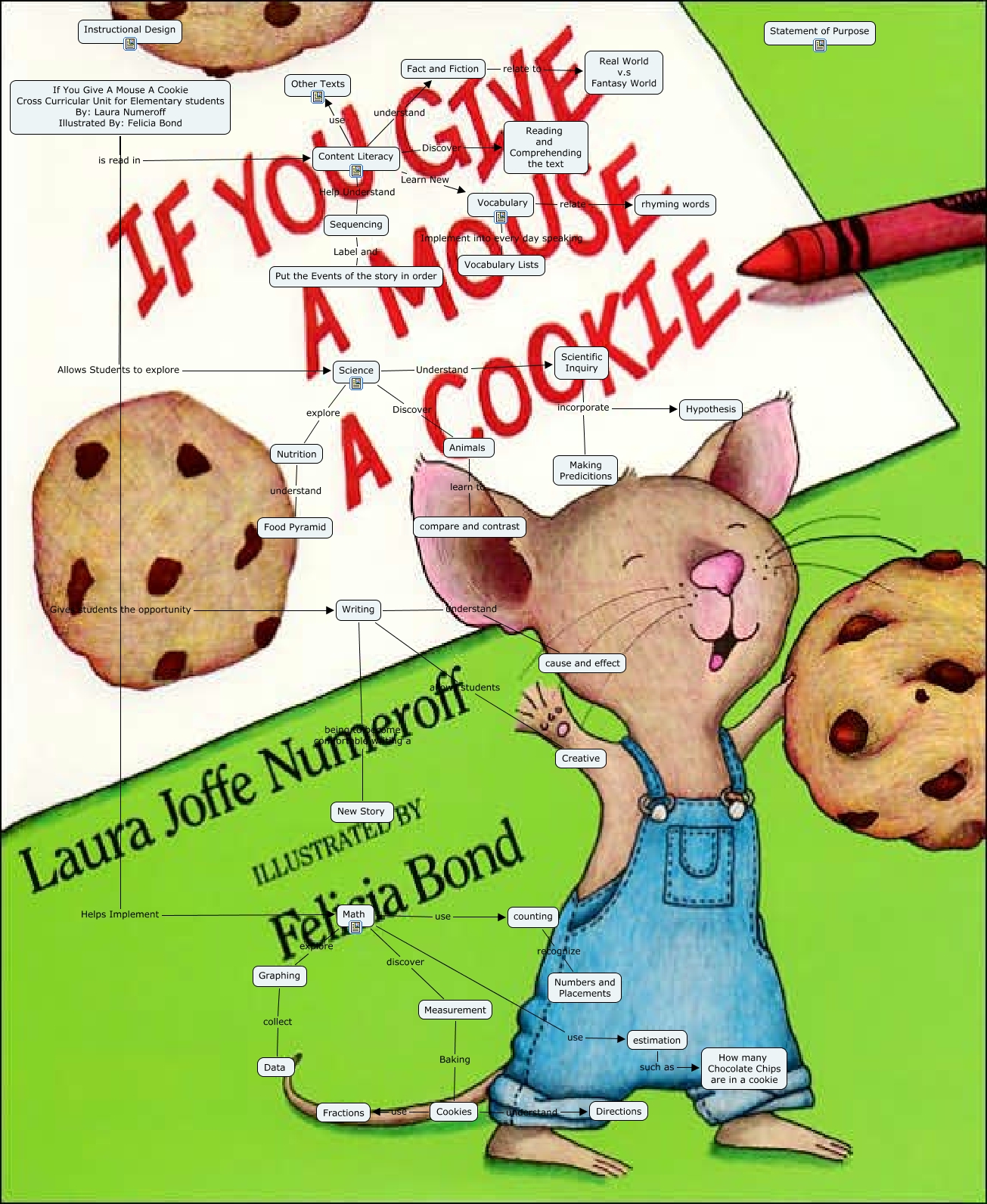 This Concept Map, created with IHMC CmapTools, has information related to: If You Give A Mouse A Cookie Unit_Instructional Design, Writing understand cause and effect, Science Discover Animals, Math explore Graphing, Writing being to become comfortable writing a New Story, Content Literacy Discover Reading and Comprehending the text, If You Give A Mouse A Cookie Cross Curricular Unit for Elementary students By: Laura Numeroff Illustrated By: Felicia Bond is read in Content Literacy, Cookies use Fractions, Math discover Measurement, If You Give A Mouse A Cookie Cross Curricular Unit for Elementary students By: Laura Numeroff Illustrated By: Felicia Bond Helps Implement Math, Content Literacy Help Understand Sequencing, Vocabulary Implement into every day speaking Vocabulary Lists, Scientific Inquiry incorporate Making Predicitions, Science explore Nutrition, If You Give A Mouse A Cookie Cross Curricular Unit for Elementary students By: Laura Numeroff Illustrated By: Felicia Bond Allows Students to explore Science, Math use counting, Content Literacy Learn New Vocabulary, Cookies understand Directions, Nutrition understand Food Pyramid, Fact and Fiction relate to Real World v.s Fantasy World, Content Literacy understand Fact and Fiction