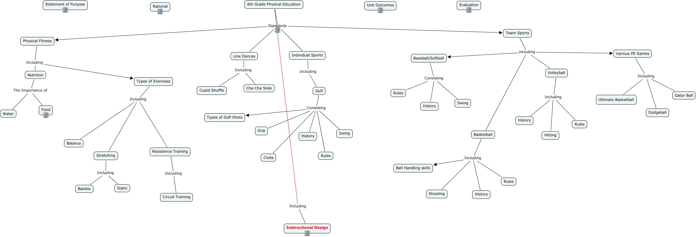 This Concept Map, created with IHMC CmapTools, has information related to: CodyCramer Instructional Design- Basketball, Types of Exercises Including Resistence Training, Stretching Including Balistic, Baseball/Softball Consisting Rules, Line Dances Including Cha Cha Slide, 6th Grade Physical Education Including Instructional Design, Nutrition The Importance of Water, 6th Grade Physical Education Standards Individual Sports, 6th Grade Physical Education Standards Line Dances, Line Dances Including Cupid Shuffle, Basketball Including History, Basketball Including Ball Handling skills, Various PE Games Including Dodgeball, Volleyball Including Hitting, Golf Consisting Grip, Team Sports including Volleyball, Golf Consisting History, Various PE Games Including Ultimate Basketball, Team Sports including Baseball/Softball, Golf Consisting Rules, Volleyball Including Rules