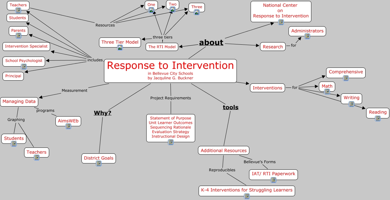 This Concept Map, created with IHMC CmapTools, has information related to: BucknerJInstructional Design, Response to Intervention in Bellevue City Schools by Jacquline G. Buckner about National Center on Response to Intervention, The RTI Model three tiers Two, Response to Intervention in Bellevue City Schools by Jacquline G. Buckner tools Additional Resources, Managing Data Graphing Students, Response to Intervention in Bellevue City Schools by Jacquline G. Buckner about The RTI Model, Teachers Resources Three, The RTI Model three tiers One, Interventions for Math, Response to Intervention in Bellevue City Schools by Jacquline G. Buckner Why? District Goals, The RTI Model three tiers Two, Response to Intervention in Bellevue City Schools by Jacquline G. Buckner includes School Psychologist, Interventions for Reading, The RTI Model three tiers Three Tier Model, Response to Intervention in Bellevue City Schools by Jacquline G. Buckner includes Students, Interventions for Writing, Response to Intervention in Bellevue City Schools by Jacquline G. Buckner includes Parents, Response to Intervention in Bellevue City Schools by Jacquline G. Buckner Measurement Managing Data, The RTI Model three tiers Three, Additional Resources Reproducibles K-4 Interventions for Struggling Learners, Managing Data programs AimsWEb