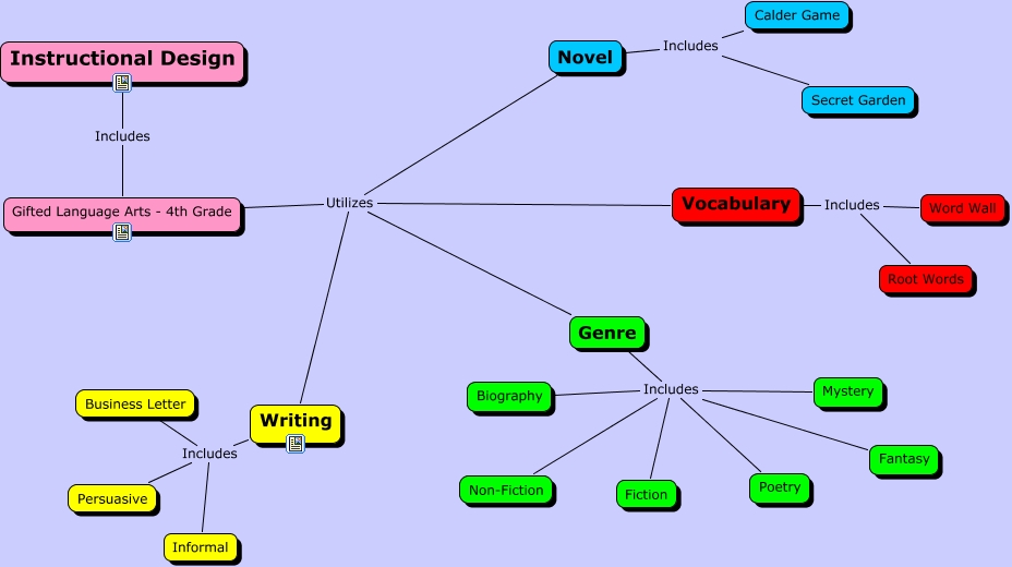 This Concept Map, created with IHMC CmapTools, has information related to: Brenda Wilson Instructional Design - 4th Grade Gifted Language Arts, Novel Includes Secret Garden, Genre Includes Fantasy, Genre Includes Non-Fiction, Writing Includes Informal, Genre Includes Poetry, Genre Includes Biography, Vocabulary Includes Word Wall, Gifted Language Arts - 4th Grade Utilizes Novel, Writing Includes Persuasive, Genre Includes Mystery, Gifted Language Arts - 4th Grade Utilizes Writing, Gifted Language Arts - 4th Grade Utilizes Genre, Instructional Design Includes Gifted Language Arts - 4th Grade, Novel Includes Calder Game, Vocabulary Includes Root Words, Writing Includes Business Letter, Genre Includes Fiction, Gifted Language Arts - 4th Grade Utilizes Vocabulary