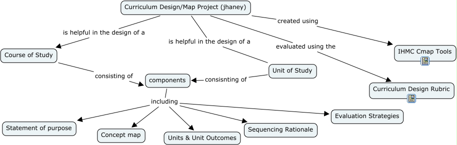 This Concept Map, created with IHMC CmapTools, has information related to: jhaney.curriculumdesign, Curriculum Design/Map Project (jhaney) is helpful in the design of a Course of Study, components including Concept map, Curriculum Design/Map Project (jhaney) is helpful in the design of a Unit of Study, Curriculum Design/Map Project (jhaney) created using IHMC Cmap Tools, components including Evaluation Strategies, Course of Study consisting of components, Curriculum Design/Map Project (jhaney) evaluated using the Curriculum Design Rubric, Unit of Study consisnting of components, components including Statement of purpose, components including Units & Unit Outcomes, components including Sequencing Rationale