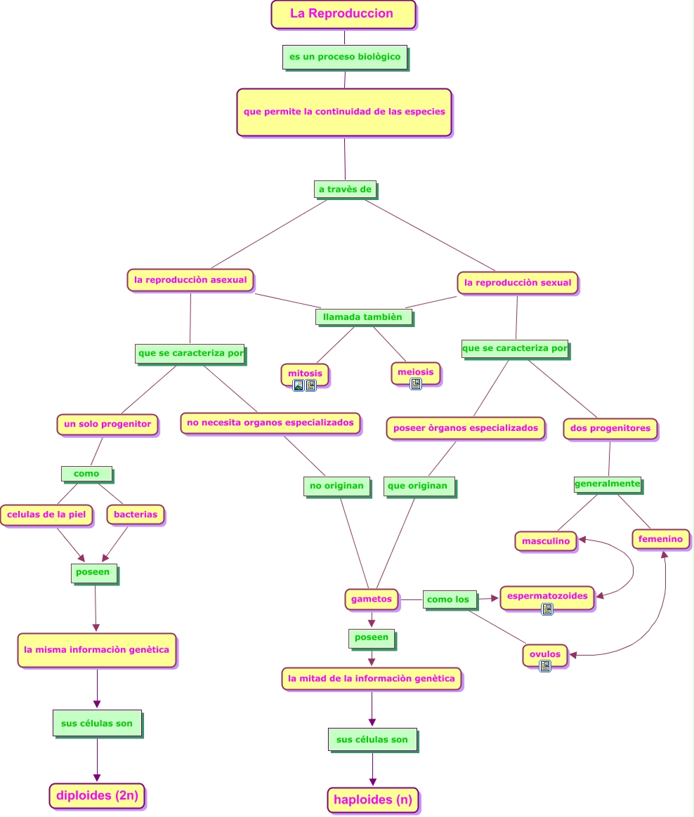 Este Cmap, tiene información relacionada con: REPRODUCCION, dos progenitores generalmente femenino, la mitad de la informaciòn genètica sus células son haploides (n), gametos como los ovulos, un solo progenitor como bacterias, gametos poseen la mitad de la informaciòn genètica, poseer òrganos especializados que originan gametos, que permite la continuidad de las especies a travès de la reproducciòn asexual, la reproducciòn sexual llamada tambièn mitosis, femenino ovulos, no necesita organos especializados no originan gametos, celulas de la piel poseen la misma informaciòn genètica, bacterias poseen la misma informaciòn genètica, la reproducciòn asexual llamada tambièn meiosis, la reproducciòn asexual que se caracteriza por un solo progenitor, la reproducciòn sexual llamada tambièn meiosis, gametos como los espermatozoides, La Reproduccion es un proceso biològico que permite la continuidad de las especies, la reproducciòn sexual que se caracteriza por dos progenitores, dos progenitores generalmente masculino, la reproducciòn asexual llamada tambièn mitosis