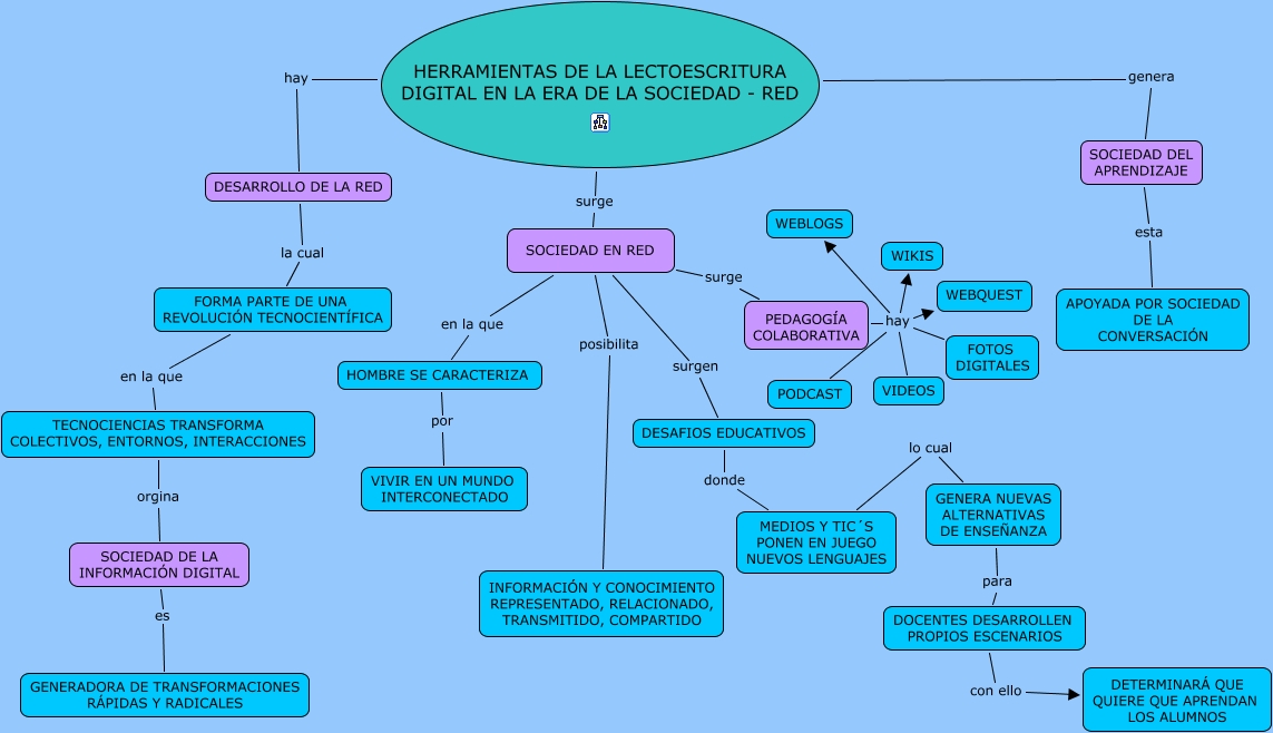 Este Cmap, tiene información relacionada con: HERRAMIENTAS DE LA LECTOESCRITURA, SOCIEDAD EN RED surgen DESAFIOS EDUCATIVOS, DESAFIOS EDUCATIVOS donde MEDIOS Y TIC´S PONEN EN JUEGO NUEVOS LENGUAJES, DOCENTES DESARROLLEN PROPIOS ESCENARIOS con ello DETERMINARÁ QUE QUIERE QUE APRENDAN LOS ALUMNOS, PEDAGOGÍA COLABORATIVA hay WEBLOGS, PEDAGOGÍA COLABORATIVA hay WEBQUEST, HOMBRE SE CARACTERIZA por VIVIR EN UN MUNDO INTERCONECTADO, DESARROLLO DE LA RED la cual FORMA PARTE DE UNA REVOLUCIÓN TECNOCIENTÍFICA, SOCIEDAD DEL APRENDIZAJE esta APOYADA POR SOCIEDAD DE LA CONVERSACIÓN, MEDIOS Y TIC´S PONEN EN JUEGO NUEVOS LENGUAJES lo cual GENERA NUEVAS ALTERNATIVAS DE ENSEÑANZA, HERRAMIENTAS DE LA LECTOESCRITURA DIGITAL EN LA ERA DE LA SOCIEDAD - RED surge SOCIEDAD EN RED, SOCIEDAD EN RED surge PEDAGOGÍA COLABORATIVA, PEDAGOGÍA COLABORATIVA hay VIDEOS, SOCIEDAD DE LA INFORMACIÓN DIGITAL es GENERADORA DE TRANSFORMACIONES RÁPIDAS Y RADICALES, SOCIEDAD EN RED posibilita INFORMACIÓN Y CONOCIMIENTO REPRESENTADO, RELACIONADO, TRANSMITIDO, COMPARTIDO, SOCIEDAD EN RED en la que HOMBRE SE CARACTERIZA, HERRAMIENTAS DE LA LECTOESCRITURA DIGITAL EN LA ERA DE LA SOCIEDAD - RED hay DESARROLLO DE LA RED, TECNOCIENCIAS TRANSFORMA COLECTIVOS, ENTORNOS, INTERACCIONES orgina SOCIEDAD DE LA INFORMACIÓN DIGITAL, PEDAGOGÍA COLABORATIVA hay FOTOS DIGITALES, GENERA NUEVAS ALTERNATIVAS DE ENSEÑANZA para DOCENTES DESARROLLEN PROPIOS ESCENARIOS, PEDAGOGÍA COLABORATIVA hay PODCAST
