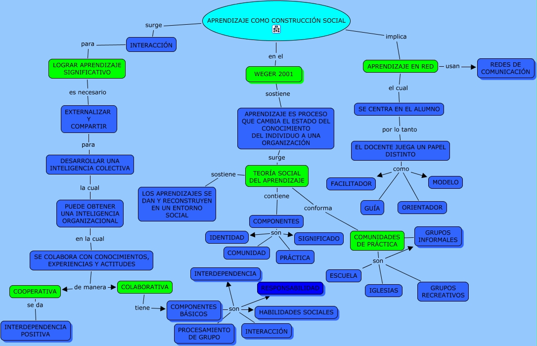 Este Cmap, tiene información relacionada con: APRENDIZAJE COMO CONSTRUCCIÓN SOCIAL, SE COLABORA CON CONOCIMIENTOS, EXPERIENCIAS Y ACTITUDES de manera COOPERATIVA, EXTERNALIZAR Y COMPARTIR para DESARROLLAR UNA INTELIGENCIA COLECTIVA, COMPONENTES BÁSICOS son HABILIDADES SOCIALES, INTERACCIÓN para LOGRAR APRENDIZAJE SIGNIFICATIVO, TEORÍA SOCIAL DEL APRENDIZAJE conforma COMUNIDADES DE PRÁCTICA, DESARROLLAR UNA INTELIGENCIA COLECTIVA la cual PUEDE OBTENER UNA INTELIGENCIA ORGANIZACIONAL, PUEDE OBTENER UNA INTELIGENCIA ORGANIZACIONAL en la cual SE COLABORA CON CONOCIMIENTOS, EXPERIENCIAS Y ACTITUDES, COMPONENTES BÁSICOS son INTERACCIÓN, APRENDIZAJE COMO CONSTRUCCIÓN SOCIAL implica APRENDIZAJE EN RED, COMPONENTES son COMUNIDAD, APRENDIZAJE EN RED el cual SE CENTRA EN EL ALUMNO, COOPERATIVA se da INTERDEPENDENCIA POSITIVA, COMPONENTES son IDENTIDAD, COMUNIDADES DE PRÁCTICA son ESCUELA, COLABORATIVA tiene COMPONENTES BÁSICOS, COMUNIDADES DE PRÁCTICA son IGLESIAS, COMUNIDADES DE PRÁCTICA son GRUPOS INFORMALES, TEORÍA SOCIAL DEL APRENDIZAJE contiene COMPONENTES, EL DOCENTE JUEGA UN PAPEL DISTINTO como MODELO, LOGRAR APRENDIZAJE SIGNIFICATIVO es necesario EXTERNALIZAR Y COMPARTIR