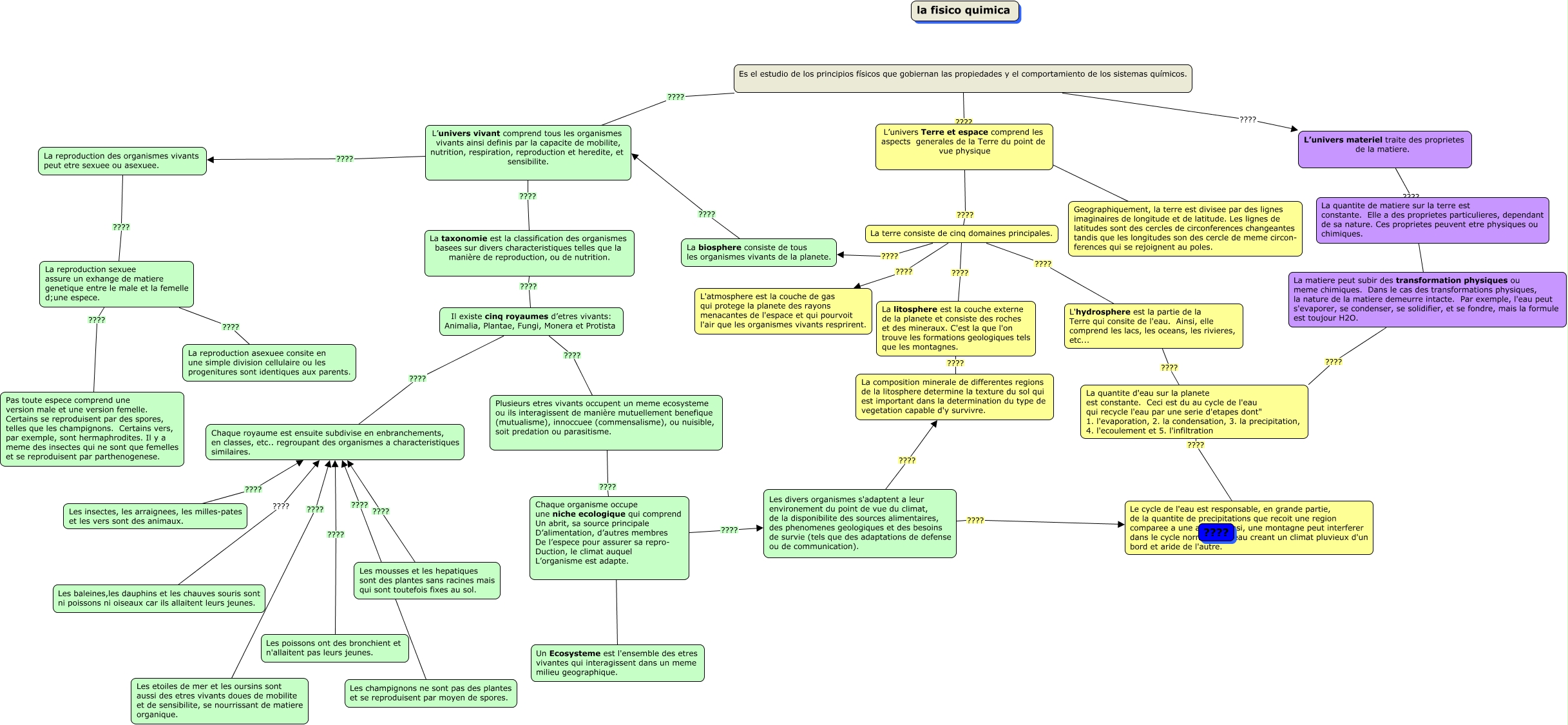 Este Cmap, tiene información relacionada con: Un nouveau monde, Es el estudio de los principios físicos que gobiernan las propiedades y el comportamiento de los sistemas químicos. ???? L’univers vivant comprend tous les organismes vivants ainsi definis par la capacite de mobilite, nutrition, respiration, reproduction et heredite, et sensibilite., La reproduction sexuee assure un exhange de matiere genetique entre le male et la femelle d;une espece. ???? La reproduction asexuee consite en une simple division cellulaire ou les progenitures sont identiques aux parents., Es el estudio de los principios físicos que gobiernan las propiedades y el comportamiento de los sistemas químicos. ???? L’univers Terre et espace comprend les aspects generales de la Terre du point de vue physique, Plusieurs etres vivants occupent un meme ecosysteme ou ils interagissent de manière mutuellement benefique (mutualisme), innoccuee (commensalisme), ou nuisible, soit predation ou parasitisme. ???? Chaque organisme occupe une niche ecologique qui comprend Un abrit, sa source principale D’alimentation, d’autres membres De l’espece pour assurer sa repro- Duction, le climat auquel L’organisme est adapte., Chaque organisme occupe une niche ecologique qui comprend Un abrit, sa source principale D’alimentation, d’autres membres De l’espece pour assurer sa repro- Duction, le climat auquel L’organisme est adapte. ???? Les divers organismes s'adaptent a leur environement du point de vue du climat, de la disponibilite des sources alimentaires, des phenomenes geologiques et des besoins de survie (tels que des adaptations de defense ou de communication)., Le cycle de l'eau est responsable, en grande partie, de la quantite de precipitations que recoit une region comparee a une autre. Ainsi, une montagne peut interferer dans le cycle normale de l'eau creant un climat pluvieux d'un bord et aride de l'autre. ???? ????, Les etoiles de mer et les oursins sont aussi des etres vivants doues de mobilite et de sensibilite, se nourrissant de matiere organique. ???? Chaque royaume est ensuite subdivise en enbranchements, en classes, etc.. regroupant des organismes a characteristiques similaires., Les baleines,les dauphins et les chauves souris sont ni poissons ni oiseaux car ils allaitent leurs jeunes. ???? Chaque royaume est ensuite subdivise en enbranchements, en classes, etc.. regroupant des organismes a characteristiques similaires., La reproduction des organismes vivants peut etre sexuee ou asexuee. ???? La reproduction sexuee assure un exhange de matiere genetique entre le male et la femelle d;une espece., L’univers vivant comprend tous les organismes vivants ainsi definis par la capacite de mobilite, nutrition, respiration, reproduction et heredite, et sensibilite. ???? La taxonomie est la classification des organismes basees sur divers characteristiques telles que la manière de reproduction, ou de nutrition., La terre consiste de cinq domaines principales. ???? L'hydrosphere est la partie de la Terre qui consite de l'eau. Ainsi, elle comprend les lacs, les oceans, les rivieres, etc..., La matiere peut subir des transformation physiques ou meme chimiques. Dans le cas des transformations physiques, la nature de la matiere demeurre intacte. Par exemple, l'eau peut s'evaporer, se condenser, se solidifier, et se fondre, mais la formule est toujour H2O. ???? La quantite d'eau sur la planete est constante. Ceci est du au cycle de l'eau qui recycle l'eau par une serie d'etapes dont" 1. l'evaporation, 2. la condensation, 3. la precipitation, 4. l'ecoulement et 5. l'infiltration, Les divers organismes s'adaptent a leur environement du point de vue du climat, de la disponibilite des sources alimentaires, des phenomenes geologiques et des besoins de survie (tels que des adaptations de defense ou de communication). ???? La composition minerale de differentes regions de la litosphere determine la texture du sol qui est important dans la determination du type de vegetation capable d'y survivre., La taxonomie est la classification des organismes basees sur divers characteristiques telles que la manière de reproduction, ou de nutrition. ???? Il existe cinq royaumes d’etres vivants: Animalia, Plantae, Fungi, Monera et Protista, Il existe cinq royaumes d’etres vivants: Animalia, Plantae, Fungi, Monera et Protista ???? Plusieurs etres vivants occupent un meme ecosysteme ou ils interagissent de manière mutuellement benefique (mutualisme), innoccuee (commensalisme), ou nuisible, soit predation ou parasitisme., La quantite d'eau sur la planete est constante. Ceci est du au cycle de l'eau qui recycle l'eau par une serie d'etapes dont" 1. l'evaporation, 2. la condensation, 3. la precipitation, 4. l'ecoulement et 5. l'infiltration ???? Le cycle de l'eau est responsable, en grande partie, de la quantite de precipitations que recoit une region comparee a une autre. Ainsi, une montagne peut interferer dans le cycle normale de l'eau creant un climat pluvieux d'un bord et aride de l'autre., Il existe cinq royaumes d’etres vivants: Animalia, Plantae, Fungi, Monera et Protista ???? Chaque royaume est ensuite subdivise en enbranchements, en classes, etc.. regroupant des organismes a characteristiques similaires., La reproduction sexuee assure un exhange de matiere genetique entre le male et la femelle d;une espece. ???? Pas toute espece comprend une version male et une version femelle. Certains se reproduisent par des spores, telles que les champignons. Certains vers, par exemple, sont hermaphrodites. Il y a meme des insectes qui ne sont que femelles et se reproduisent par parthenogenese., La biosphere consiste de tous les organismes vivants de la planete. ???? L’univers vivant comprend tous les organismes vivants ainsi definis par la capacite de mobilite, nutrition, respiration, reproduction et heredite, et sensibilite., L'hydrosphere est la partie de la Terre qui consite de l'eau. Ainsi, elle comprend les lacs, les oceans,