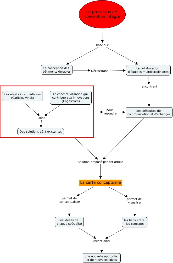 Cette carte de concepts créée avec IHMC CmapTools traite de: Article, La collaboration d'équipes multidisciplinaires rencontrant des difficultés de communication et d'échanges, les idéées de chaque spécialité créant ainsi une nouvelle approche et de nouvelles idées, Le processus de conception intégré basé sur La collaboration d'équipes multidisciplinaires, Les objets intermédiaires (Carlisle, Vinck) sont Des solutions dèjà existantes, La carte conceptuelle permet de conceptualiser les idéées de chaque spécialité, Solution proposé par cet article La carte conceptuelle, des difficultés de communication et d'échanges Solution proposé par cet article La carte conceptuelle, pour résoudre des difficultés de communication et d'échanges, La conceptualisation qui contribue aux innovations (Engeström) sont Des solutions dèjà existantes, les liens entre les concepts créant ainsi une nouvelle approche et de nouvelles idées, La carte conceptuelle permet de visualiser les liens entre les concepts, Le processus de conception intégré basé sur La conception des bâtiments durables, La conception des bâtiments durables Nécessitant La collaboration d'équipes multidisciplinaires