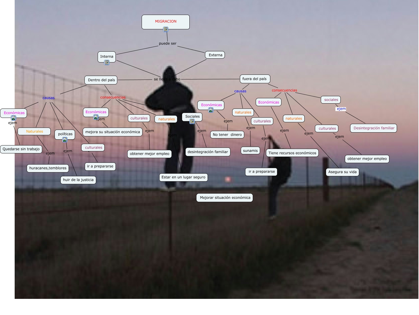 Este Cmap, tiene información relacionada con: mapa Conceptual de Migración, Externa se lleva a cabo Dentro del país, Dentro del país consecuencias culturales, fuera del país consecuencias sociales, MIGRACION puede ser Externa, fuera del país consecuencias naturales, culturales ejem ir a prepararse, Interna se lleva a cabo fuera del país, Dentro del país causas culturales, MIGRACION puede ser Interna, Económicas ejem mejora su situación económica, Externa se lleva a cabo fuera del país, Económicas ejem Tiene recursos económicos, culturales ejem obtener mejor empleo, fuera del país causas culturales, Dentro del país consecuencias naturales, políticas ejem huir de la justicia, culturales ejem ir a prepararse, naturales ejem Asegura su vida, Dentro del país causas Económicas, naturales ejem sunamis