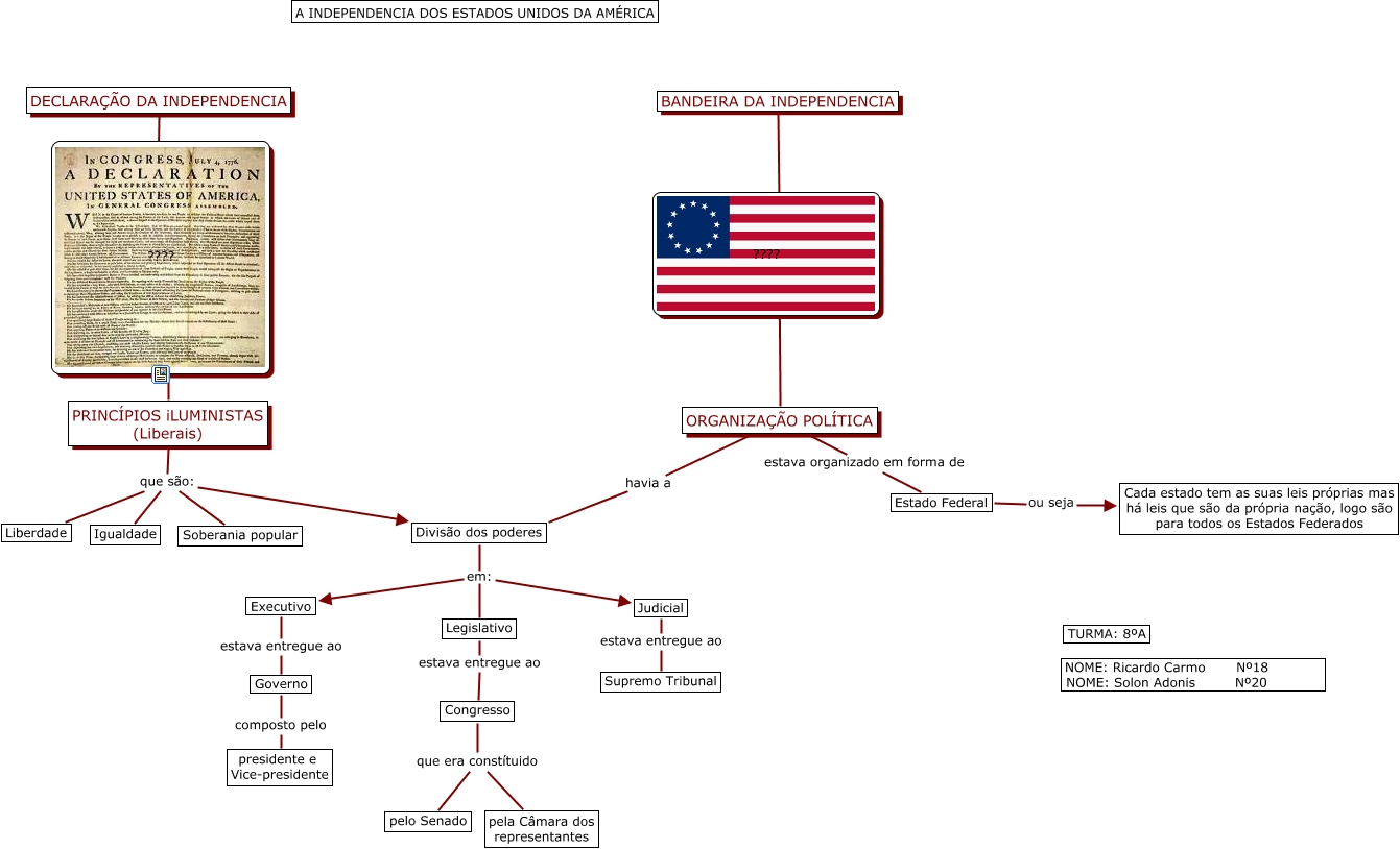 Esse mapa conceitual, produzido no IHMC CmapTools, tem a informação relacionada a: INDEPENDENCIA_AMERICANA, Divisão dos poderes em: Executivo, Legislativo estava entregue ao Congresso, Divisão dos poderes em: Legislativo, Congresso que era constítuido pelo Senado, ORGANIZAÇÃO POLÍTICA havia a Divisão dos poderes, Judicial estava entregue ao Supremo Tribunal, Executivo estava entregue ao Governo, PRINCÍPIOS iLUMINISTAS (Liberais) que são: Soberania popular, ???? ???? ORGANIZAÇÃO POLÍTICA, Governo composto pelo presidente e Vice-presidente, ORGANIZAÇÃO POLÍTICA estava organizado em forma de Estado Federal, DECLARAÇÃO DA INDEPENDENCIA ???? ????, Estado Federal ou seja Cada estado tem as suas leis próprias mas há leis que são da própria nação, logo são para todos os Estados Federados, ???? ???? PRINCÍPIOS iLUMINISTAS (Liberais), PRINCÍPIOS iLUMINISTAS (Liberais) que são: Liberdade, Divisão dos poderes em: Judicial, PRINCÍPIOS iLUMINISTAS (Liberais) que são: Divisão dos poderes, Congresso que era constítuido pela Câmara dos representantes, PRINCÍPIOS iLUMINISTAS (Liberais) que são: Igualdade, BANDEIRA DA INDEPENDENCIA ???? ????