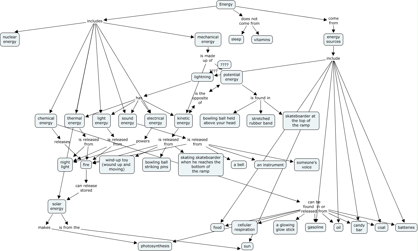 This Concept Map, created with IHMC CmapTools, has information related to: Energy 2010, solar energy makes photosynthesis, energy sources include lightning, energy sources include gasoline, energy sources include batteries, kinetic energy is released from bowling ball striking pins, lightning has sound energy, Energy includes thermal energy, sound energy is released from an instrument, light energy is released from fire, chemical energy releases fire, Energy includes sound energy, solar energy is from the sun, thermal energy is released from fire, chemical energy can be found in or released from candy bar, mechanical energy is made up of potential energy, electrical energy powers night light, potential energy is the opposite of kinetic energy, lightning has thermal energy, fire can release stored solar energy, energy sources include candy bar