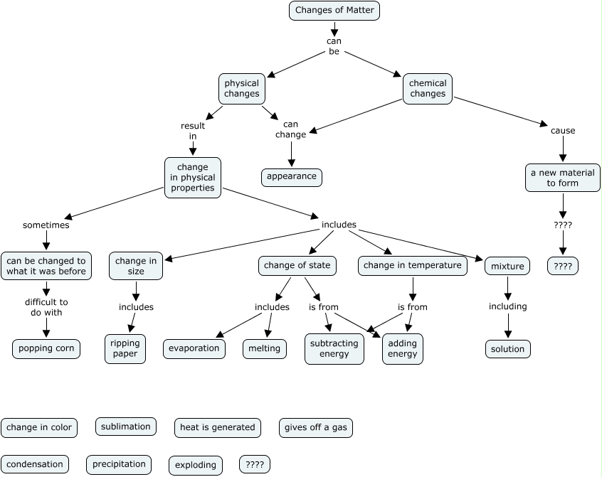 This Concept Map, created with IHMC CmapTools, has information related to: Chemical and Physical Changes, change in temperature is from adding energy, chemical changes cause a new material to form, change of state includes evaporation, change of state includes melting, Changes of Matter can be physical changes, change in physical properties includes change in temperature, a new material to form ???? ????, change in physical properties includes change in size, change of state is from subtracting energy, physical changes result in change in physical properties, change of state is from adding energy, mixture including solution, change in physical properties sometimes can be changed to what it was before, Changes of Matter can be chemical changes, chemical changes can change appearance, can be changed to what it was before difficult to do with popping corn, change in size includes ripping paper, change in temperature is from subtracting energy, change in physical properties includes change of state, physical changes can change appearance