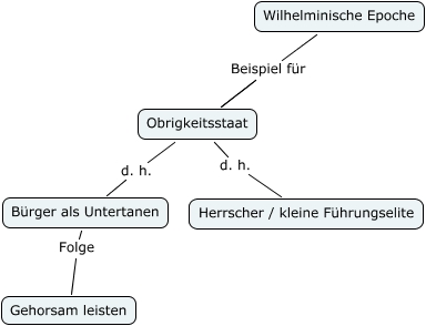Dieses mit IHMC CmapTools erstellte CMap hat Informationen bezüglich: Test, Wilhelminische Epoche Beispiel für Obrigkeitsstaat, Wilhelminische Epoche Beispiel für Obrigkeitsstaat, Obrigkeitsstaat d. h. Herrscher / kleine Führungselite, Obrigkeitsstaat d. h. Bürger als Untertanen, Bürger als Untertanen Folge Gehorsam leisten