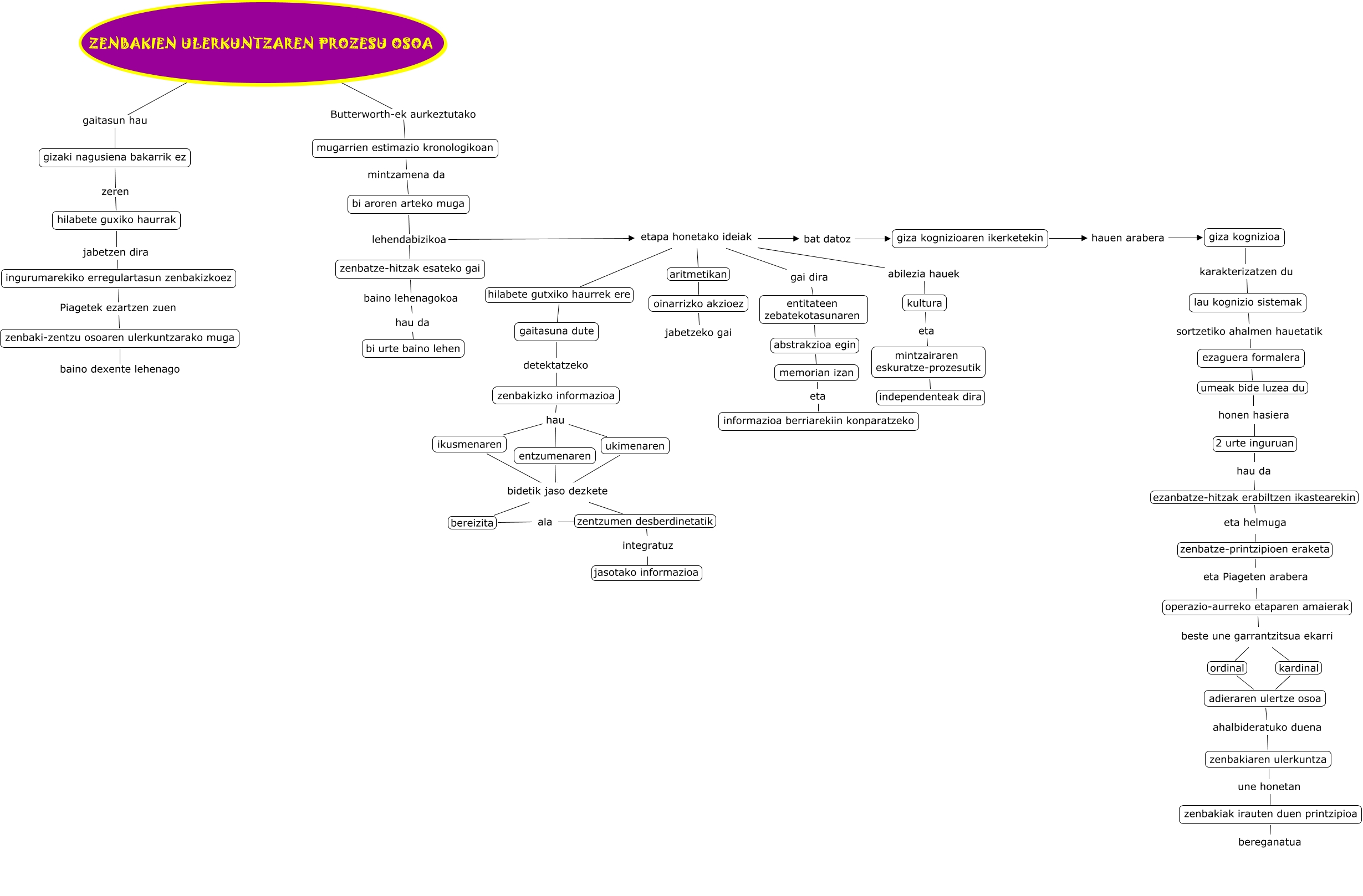 Este Cmap, tiene información relacionada con: ZENBAKIEN ULERKUNTZAREN PROZESU OSOA, giza kognizioaren ikerketekin hauen arabera giza kognizioa, zenbatze-hitzak esateko gai baino lehenagokoa hau da, zenbakiaren ulerkuntza une honetan zenbakiak irauten duen printzipioa, memorian izan eta informazioa berriarekiin konparatzeko, bidetik jaso dezkete zentzumen desberdinetatik integratuz, ala zentzumen desberdinetatik integratuz, zenbaki-zentzu osoaren ulerkuntzarako muga baino dexente lehenago, eta helmuga zenbatze-printzipioen eraketa eta Piageten arabera, hau da ezanbatze-hitzak erabiltzen ikastearekin eta helmuga, zenbakizko informazioa hau ukimenaren, beste une garrantzitsua ekarri ordinal adieraren ulertze osoa, gaitasuna dute detektatzeko zenbakizko informazioa, zenbakiak irauten duen printzipioa bereganatua, mintzairaren eskuratze-prozesutik independenteak dira, etapa honetako ideiak gai dira entitateen zebatekotasunaren, ZENBAKIEN ULERKUNTZAREN PROZESU OSOA gaitasun hau gizaki nagusiena bakarrik ez, kultura eta mintzairaren eskuratze-prozesutik, integratuz jasotako informazioa, entzumenaren ???? bidetik jaso dezkete, hilabete guxiko haurrak jabetzen dira ingurumarekiko erregulartasun zenbakizkoez
