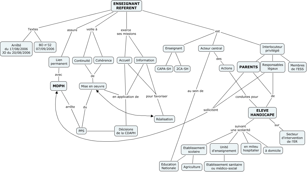 Cette carte de concepts créée avec IHMC CmapTools traite de: Enseignant Référent, Actions conduites pour ELEVE HANDICAPE, ELEVE HANDICAPE sur Secteur d'intervention de l'ER, Acteur central au sein de Education Nationale, ENSEIGNANT REFERENT veille à Continuité, Cohérence de Mise en oeuvre, ELEVE HANDICAPE suivant une scolarité Unité d'enseignement, ELEVE HANDICAPE suivant une scolarité Etablissement scolaire, Interlocuteur privilégié PARENTS, Responsables légaux sollicitent MDPH, Responsables légaux de ELEVE HANDICAPE, ENSEIGNANT REFERENT est Interlocuteur privilégié, Etablissement scolaire Agriculture, Mise en oeuvre du PPS, Accueil pour favoriser Réalisation, Enseignant CAPA-SH, PARENTS de ELEVE HANDICAPE, ENSEIGNANT REFERENT exerce ses missions Accueil, Acteur central des Actions, ENSEIGNANT REFERENT est Acteur central, ENSEIGNANT REFERENT veille à Cohérence