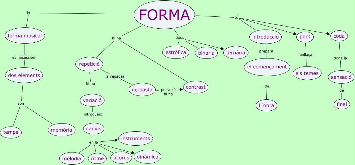 Este Cmap, tiene información relacionada con: Unitat 9, sensació de final, canvis en la instruments, no basta per això hi ha contrast, introducció prepara el començament, FORMA la forma musical, repetició hi ha variació, canvis en la ritme, pont enllaça els temes, canvis en la melodia, FORMA hi ha repetició, variació introdueix canvis, FORMA té coda, canvis en la acords, coda dona la sensació, canvis en la dinàmica, dos elements són memòria, FORMA té introducció, el començament de l´obra, FORMA tipus estròfica, FORMA hi ha contrast