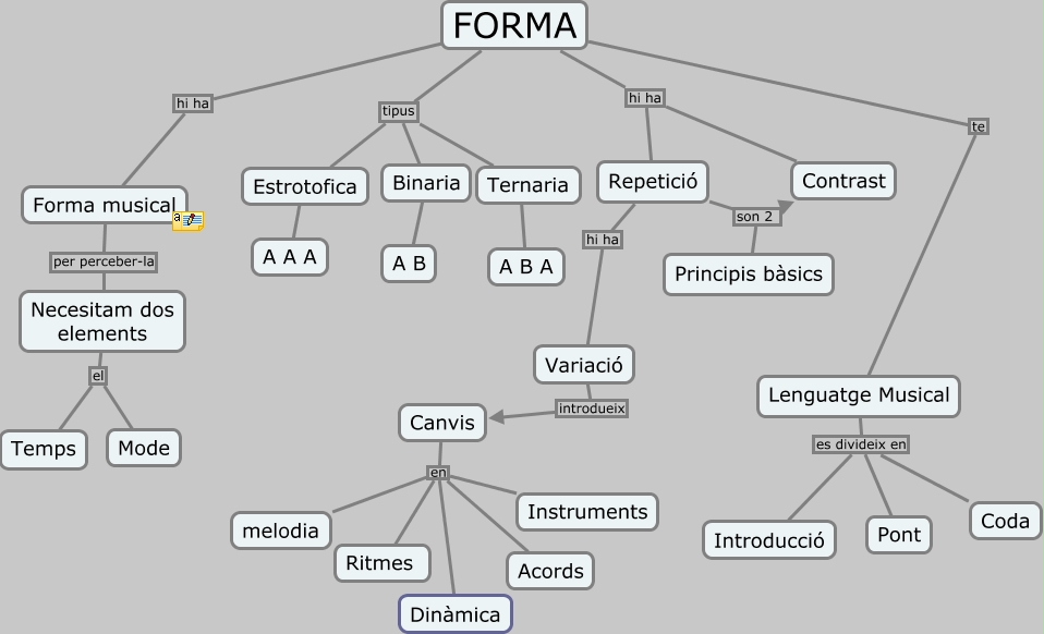 Este Cmap, tiene información relacionada con: UNITAT-9(La Forma), Repetició son 2 Contrast, Canvis en Ritmes, Forma musical per perceber-la Necesitam dos elements, FORMA tipus Ternaria, FORMA hi ha Contrast, Estrotofica ???? A A A, Canvis en Dinàmica, Repetició son 2 Principis bàsics, Variació introdueix Canvis, FORMA tipus Binaria, FORMA tipus Estrotofica, Canvis en melodia, Lenguatge Musical es divideix en Introducció, FORMA hi ha Repetició, FORMA hi ha Forma musical, FORMA te Lenguatge Musical, Lenguatge Musical es divideix en Pont, Canvis en Instruments, Repetició hi ha Variació, Binaria ???? A B