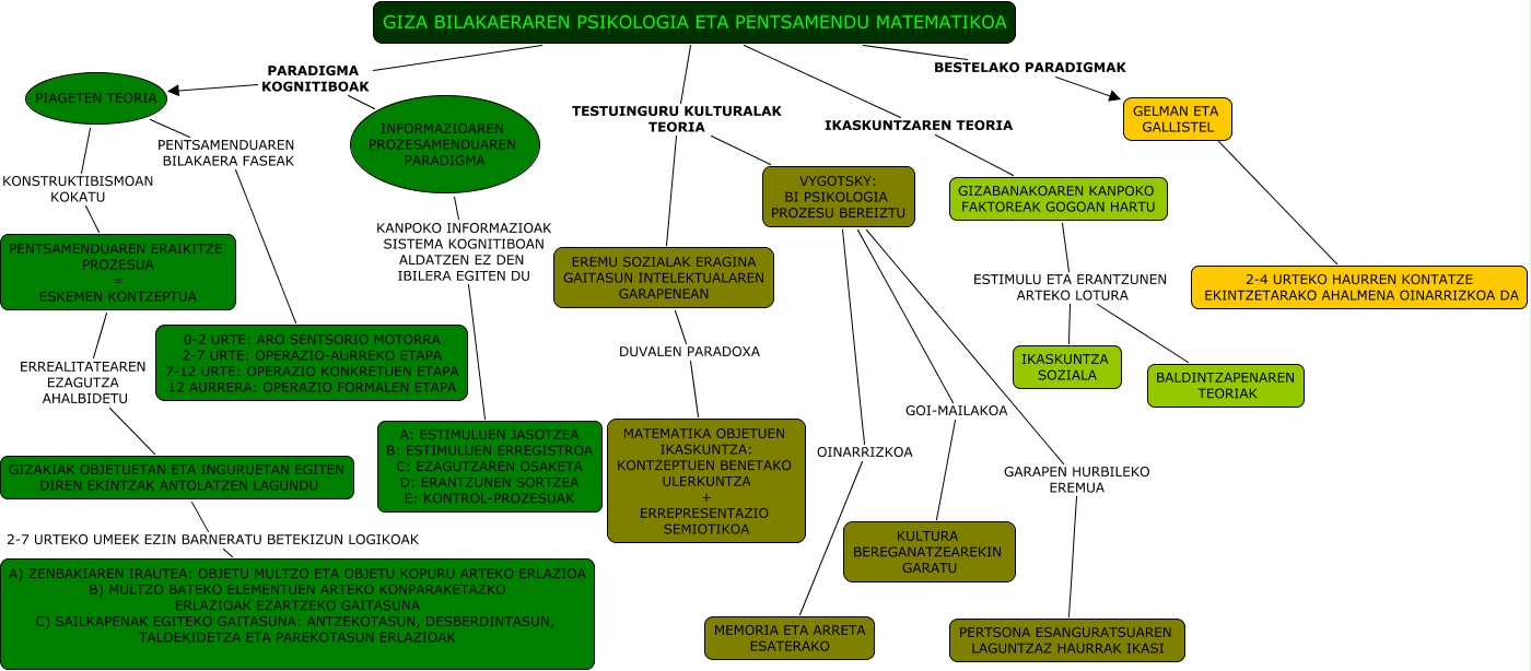 Este Cmap, tiene información relacionada con: Giza bilakaeraren psikologia eta pentsamendu matematikoa, PIAGETEN TEORIA KONSTRUKTIBISMOAN KOKATU PENTSAMENDUAREN ERAIKITZE PROZESUA = ESKEMEN KONTZEPTUA, GIZA BILAKAERAREN PSIKOLOGIA ETA PENTSAMENDU MATEMATIKOA PARADIGMA KOGNITIBOAK INFORMAZIOAREN PROZESAMENDUAREN PARADIGMA, GIZABANAKOAREN KANPOKO FAKTOREAK GOGOAN HARTU ESTIMULU ETA ERANTZUNEN ARTEKO LOTURA BALDINTZAPENAREN TEORIAK, GIZAKIAK OBJETUETAN ETA INGURUETAN EGITEN DIREN EKINTZAK ANTOLATZEN LAGUNDU 2-7 URTEKO UMEEK EZIN BARNERATU BETEKIZUN LOGIKOAK A) ZENBAKIAREN IRAUTEA: OBJETU MULTZO ETA OBJETU KOPURU ARTEKO ERLAZIOA B) MULTZO BATEKO ELEMENTUEN ARTEKO KONPARAKETAZKO ERLAZIOAK EZARTZEKO GAITASUNA C) SAILKAPENAK EGITEKO GAITASUNA: ANTZEKOTASUN, DESBERDINTASUN, TALDEKIDETZA ETA PAREKOTASUN ERLAZIOAK, GIZA BILAKAERAREN PSIKOLOGIA ETA PENTSAMENDU MATEMATIKOA PARADIGMA KOGNITIBOAK PIAGETEN TEORIA, VYGOTSKY: BI PSIKOLOGIA PROZESU BEREIZTU GOI-MAILAKOA KULTURA BEREGANATZEAREKIN GARATU, PENTSAMENDUAREN ERAIKITZE PROZESUA = ESKEMEN KONTZEPTUA ERREALITATEAREN EZAGUTZA AHALBIDETU GIZAKIAK OBJETUETAN ETA INGURUETAN EGITEN DIREN EKINTZAK ANTOLATZEN LAGUNDU, INFORMAZIOAREN PROZESAMENDUAREN PARADIGMA KANPOKO INFORMAZIOAK SISTEMA KOGNITIBOAN ALDATZEN EZ DEN IBILERA EGITEN DU A: ESTIMULUEN JASOTZEA B: ESTIMULUEN ERREGISTROA C: EZAGUTZAREN OSAKETA D: ERANTZUNEN SORTZEA E: KONTROL-PROZESUAK, GIZABANAKOAREN KANPOKO FAKTOREAK GOGOAN HARTU ESTIMULU ETA ERANTZUNEN ARTEKO LOTURA IKASKUNTZA SOZIALA, GIZA BILAKAERAREN PSIKOLOGIA ETA PENTSAMENDU MATEMATIKOA IKASKUNTZAREN TEORIA GIZABANAKOAREN KANPOKO FAKTOREAK GOGOAN HARTU, VYGOTSKY: BI PSIKOLOGIA PROZESU BEREIZTU GARAPEN HURBILEKO EREMUA PERTSONA ESANGURATSUAREN LAGUNTZAZ HAURRAK IKASI, GIZA BILAKAERAREN PSIKOLOGIA ETA PENTSAMENDU MATEMATIKOA BESTELAKO PARADIGMAK GELMAN ETA GALLISTEL, EREMU SOZIALAK ERAGINA GAITASUN INTELEKTUALAREN GARAPENEAN DUVALEN PARADOXA MATEMATIKA OBJETUEN IKASKUNTZA: KONTZEPTUEN BENETAKO ULERKUNTZA + ERREPRESENTAZIO SEMIOTIKOA, GIZA BILAKAERAREN PSIKOLOGIA ETA PENTSAMENDU MATEMATIKOA TESTUINGURU KULTURALAK TEORIA VYGOTSKY: BI PSIKOLOGIA PROZESU BEREIZTU, GELMAN ETA GALLISTEL ???? 2-4 URTEKO HAURREN KONTATZE EKINTZETARAKO AHALMENA OINARRIZKOA DA, GIZA BILAKAERAREN PSIKOLOGIA ETA PENTSAMENDU MATEMATIKOA TESTUINGURU KULTURALAK TEORIA EREMU SOZIALAK ERAGINA GAITASUN INTELEKTUALAREN GARAPENEAN, VYGOTSKY: BI PSIKOLOGIA PROZESU BEREIZTU OINARRIZKOA MEMORIA ETA ARRETA ESATERAKO, PIAGETEN TEORIA PENTSAMENDUAREN BILAKAERA FASEAK 0-2 URTE: ARO SENTSORIO MOTORRA 2-7 URTE: OPERAZIO-AURREKO ETAPA 7-12 URTE: OPERAZIO KONKRETUEN ETAPA 12 AURRERA: OPERAZIO FORMALEN ETAPA