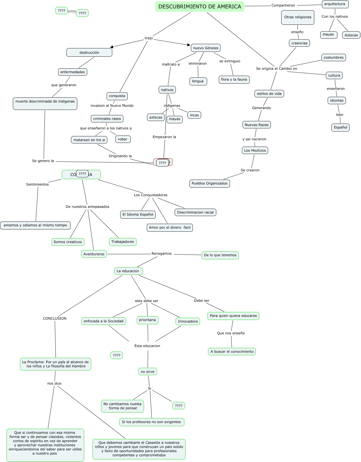 Este Cmap, tiene información relacionada con: DESCUBRIMIENTO DE AMERICA, La educacion CONCLUSION La Proclama: Por un país al alcance de los niños y La filosofía del Hambre, La educacion esta debe ser enfocada a la Sociedad, COLOMBIA Los Conquistadores Descriminacion racial, COLOMBIA Sentimientos amamos y odiamos al mismo tiempo, idiomas lider Español, DESCUBRIMIENTO DE AMERICA Compartieron arquitectura, destrucción ???? enfermedades, DESCUBRIMIENTO DE AMERICA trajo nuevo Génesis, COLOMBIA De nuestros antepasados Aventureros, COLOMBIA Los Conquistadores El Idioma Español, creencias enseño Otras religiones, La Proclama: Por un país al alcance de los niños y La filosofía del Hambre nos dice Que si continuamos con esa misma forma ser y de pensar clasistas, violentos cortos de espiritu en vez de aprender y aprovechar nuestras instituciones enriqueciendonos del saber para ser utiles a nuestro pais, Aventureros Renegamos La educacion, cultura enseñaron idiomas, no sirve Si Si los profesores no son exigentes, Para quien quiera educarse Que nos enseñe A buscar el conocimiento, Aventureros Renegamos De lo que tenemos, DESCUBRIMIENTO DE AMERICA Se origina el Cambio en estilos de vida, conquista invasion al Nuevo Mundo criminales rasos, prioritaria Esta educacion no sirve