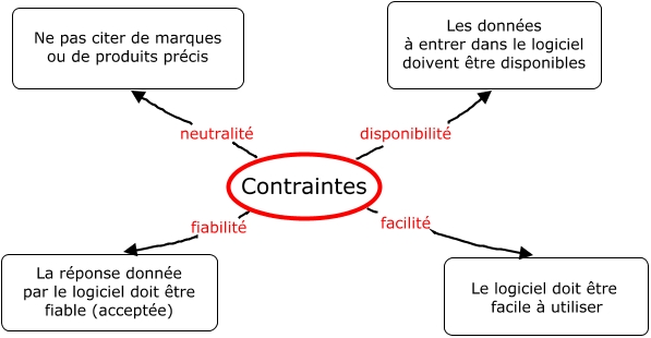 Cette carte de concepts créée avec IHMC CmapTools traite de: Contraintes, Contraintes disponibilité Les données à entrer dans le logiciel doivent être disponibles, Contraintes fiabilité La réponse donnée par le logiciel doit être fiable (acceptée), Contraintes facilité Le logiciel doit être facile à utiliser, Contraintes neutralité Ne pas citer de marques ou de produits précis