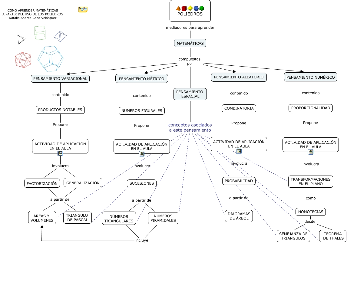 Este Cmap, tiene información relacionada con: POLIEDROS, MATEMÁTICAS compuestas por PENSAMIENTO MÉTRICO, PENSAMIENTO ESPACIAL conceptos asociados a este pensamiento NÚMEROS TRIANGULARES, PENSAMIENTO ESPACIAL conceptos asociados a este pensamiento NUMEROS PIRAMIDALES, PENSAMIENTO ESPACIAL conceptos asociados a este pensamiento TRIANGULO DE PASCAL, MATEMÁTICAS compuestas por PENSAMIENTO NUMÉRICO, PENSAMIENTO ESPACIAL conceptos asociados a este pensamiento SEMEJANZA DE TRIANGULOS, PENSAMIENTO NUMÉRICO contenido PROPORCIONALIDAD, PROBABILIDAD a partir de DIAGRAMAS DE ÁRBOL, TRANSFORMACIONES EN EL PLANO como HOMOTECIAS, MATEMÁTICAS compuestas por PENSAMIENTO ALEATORIO, NÚMEROS TRIANGULARES incluye ÁREAS Y VOLUMENES, ACTIVIDAD DE APLICACIÓN EN EL AULA involucra GENERALIZACIÓN, GENERALIZACIÓN a partir de TRIANGULO DE PASCAL, MATEMÁTICAS compuestas por PENSAMIENTO ESPACIAL, POLIEDROS mediadores para aprender MATEMÁTICAS, PRODUCTOS NOTABLES Propone ACTIVIDAD DE APLICACIÓN EN EL AULA, PENSAMIENTO ESPACIAL conceptos asociados a este pensamiento TRANSFORMACIONES EN EL PLANO, SUCESIONES a partir de NÚMEROS TRIANGULARES, PENSAMIENTO ESPACIAL conceptos asociados a este pensamiento NUMEROS PIRAMIDALES, PENSAMIENTO ESPACIAL conceptos asociados a este pensamiento NUMEROS PIRAMIDALES