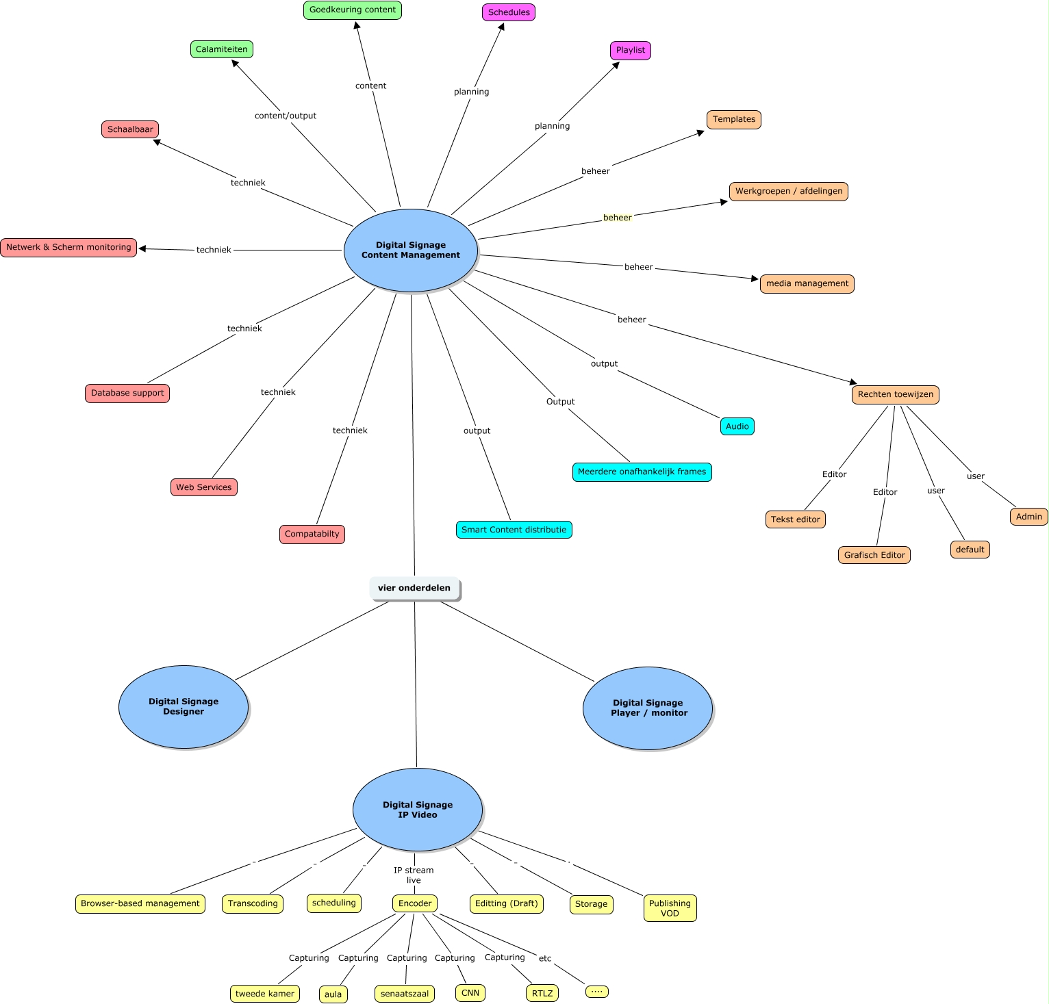 Deze Concept Map heeft informatie gerelateerd aan: NC in vier delen - content manager, Digital Signage Content Management vier onderdelen Digital Signage IP Video, Digital Signage Content Management planning Playlist, Digital Signage Content Management techniek Schaalbaar, Digital Signage Content Management output Smart Content distributie, Digital Signage Content Management output Audio, Encoder Capturing CNN, Rechten toewijzen Editor Tekst editor, Digital Signage Content Management techniek Netwerk & Scherm monitoring, Digital Signage IP Video . Editting (Draft), Digital Signage IP Video . Storage, Rechten toewijzen user Admin, Digital Signage IP Video . Transcoding, Digital Signage Content Management beheer Rechten toewijzen, Digital Signage Content Management beheer Templates, Digital Signage Content Management beheer media management, Digital Signage Content Management planning Schedules, Digital Signage Content Management content Goedkeuring content, Rechten toewijzen Editor Grafisch Editor, Encoder Capturing tweede kamer, Digital Signage Content Management Output Meerdere onafhankelijk frames
