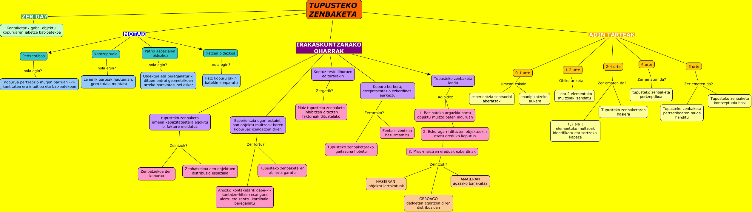 Este Cmap, tiene información relacionada con: TUPUSTEKO ZENBAKETA, TUPUSTEKO ZENBAKETA ADIN TARTEAK 4 urte, Esperientzia ugari eskaini, non objektu multzoak beren kopuruaz izendatzen diren Zer lortu? Ahozko kontaketarik gabe--> kontatze-hitzen esangura ulertu eta zentzu kardinala bereganatu, 4 urte Zer ematen da? tupusteko zenbaketa pertzeptiboa, TUPUSTEKO ZENBAKETA MOTAK Hatzen bidezkoa, TUPUSTEKO ZENBAKETA ADIN TARTEAK 0-1 urte, TUPUSTEKO ZENBAKETA IRAKASKUNTZARAKO OHARRAK Esperientzia ugari eskaini, non objektu multzoak beren kopuruaz izendatzen diren, 1-2 urte Ohiko ariketa 1 eta 2 elementuko multzoak izendatu, Tupusteko zenbaketa landu Adibidez 2. Eskuragarri dituzten objektuekin osatu ereduko kopurua, 2-4 urte Zer ematen da? 1,2 ala 3 elemantuko multzoak identifikatu eta sortzeko kapaza, Esperientzia ugari eskaini, non objektu multzoak beren kopuruaz izendatzen diren Zer lortu? Tupusteko zenbaketaren abilezia garatu, kontzeptuala nola egin? Lehenik parteak hauteman, gero totala muntatu, 3. Misu-maistren ereduak ezberdinak Zeintzuk? AMAIERAN auzazko banaketaz, tupusteko zenbaketa umeen kapazitateetara egokitu bi faktore moldatuz Zeintzuk? Zenbatzekoa den objektuen distribuzio espaziala, Kontuz testu liburuen egiturarekin Zergatik? Maiz tupusteko zenbaketa inhibitzen dituzten faktoreak dituztelako, TUPUSTEKO ZENBAKETA ADIN TARTEAK 2-4 urte, TUPUSTEKO ZENBAKETA ADIN TARTEAK 5 urte, TUPUSTEKO ZENBAKETA IRAKASKUNTZARAKO OHARRAK Tupusteko zenbaketa landu, 3. Misu-maistren ereduak ezberdinak Zeintzuk? GEROAGO dadoetan agertzen diren distribuzioan, Kopuru berbera, errepresentazio ezberdinez aurkeztu Zertarako? Tupusteko zenbaketarako gaitasuna hobetu, Hatzen bidezkoa nola egin? Hatz kopuru jakin batekin konparatu