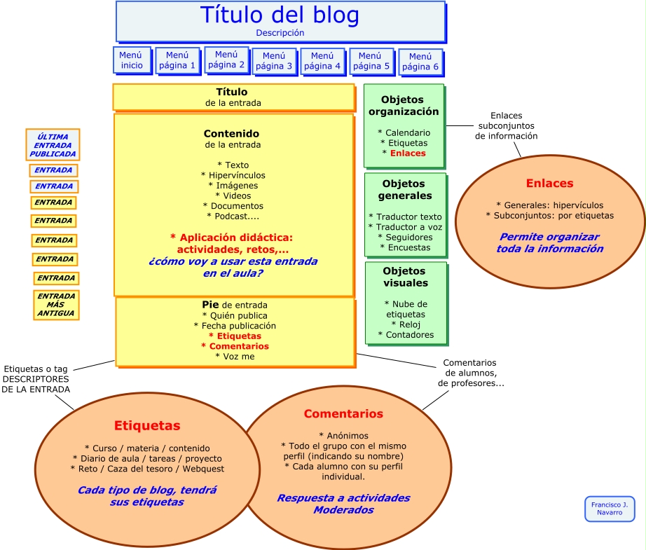 Este Cmap, tiene información relacionada con: estructura blog, Pie de entrada * Quién publica * Fecha publicación * Etiquetas * Comentarios * Voz me Comentarios de alumnos, de profesores... Comentarios * Anónimos * Todo el grupo con el mismo perfil (indicando su nombre) * Cada alumno con su perfil individual. Respuesta a actividades Moderados, Pie de entrada * Quién publica * Fecha publicación * Etiquetas * Comentarios * Voz me Etiquetas o tag DESCRIPTORES DE LA ENTRADA Etiquetas * Curso / materia / contenido * Diario de aula / tareas / proyecto * Reto / Caza del tesoro / Webquest Cada tipo de blog, tendrá sus etiquetas, Objetos organización * Calendario * Etiquetas * Enlaces Enlaces subconjuntos de información Enlaces * Generales: hipervículos * Subconjuntos: por etiquetas Permite organizar toda la información