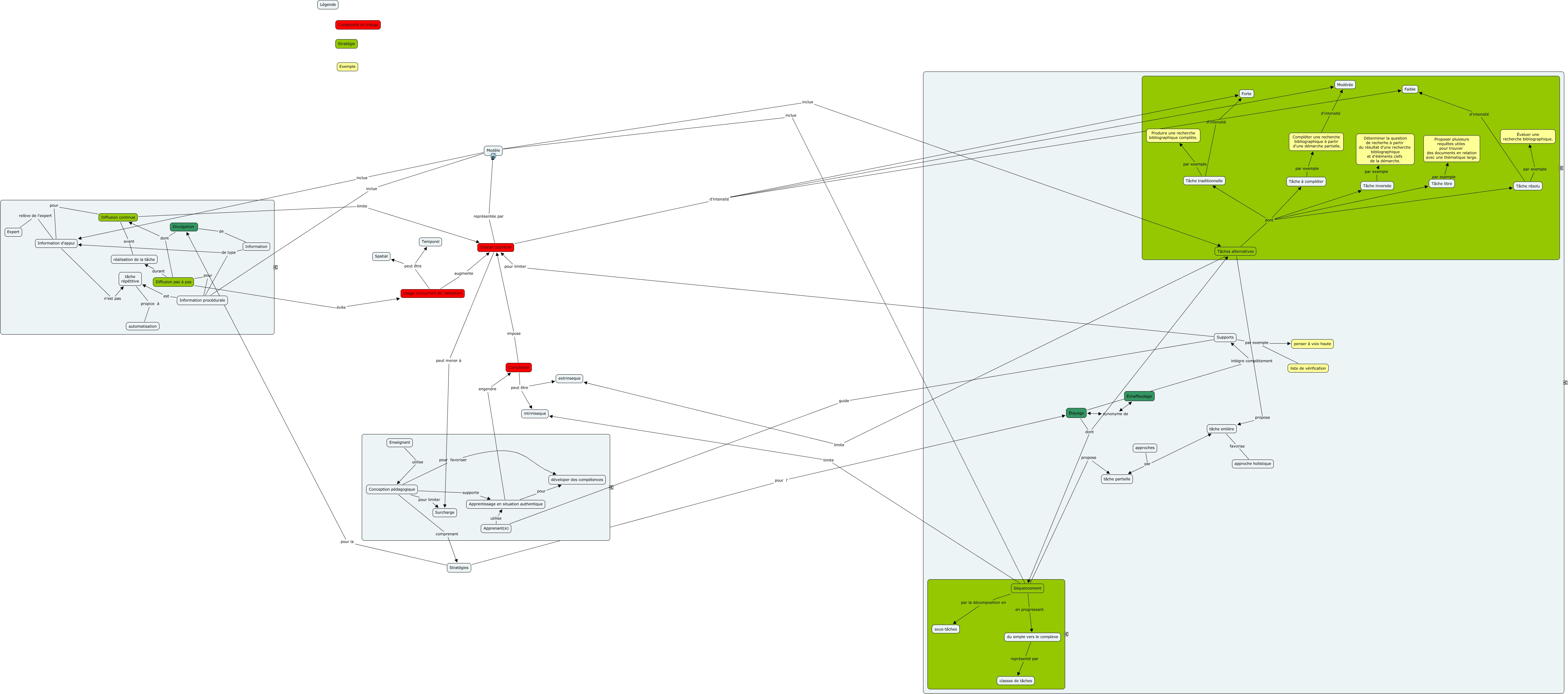 Cette carte de concepts créée avec IHMC CmapTools traite de: Carte principale complète, Diffusion pas à pas pour Information procédurale, Enseignant utilise Conception pédagogique, Tâche libre par exemple Proposer plusieurs requêtes utiles pour trouver des documents en relation avec une thématique large., Diffusion continue limite Charge cognitive, Supports par exemple penser à voix haute, Tâche traditionnelle d'intensité Forte, Compléter une recherche bibliographique à partir d'une démarche partielle. d'intensité Modérée, Conception pédagogique pour limiter Surcharge, Supports par exemple liste de vérification, Usage concurrent de l'attention peut être Spatial, Charge cognitive représentée par Modèle, Usage concurrent de l'attention peut être Temporel, Conception pédagogique comprenant Stratégies, Étayage dont Tâches alternatives, tâche entière favorise approche holistique, Tâches alternatives propose tâche entière, Charge cognitive peut mener à Surcharge, Conception pédagogique pour favoriser déveloper des compétences, Diffusion continue avant réalisation de la tâche, Modèle inclue Séquencement