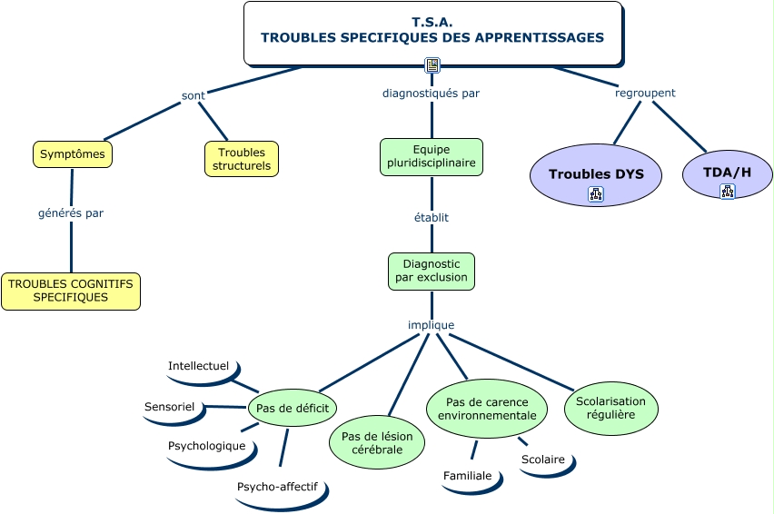 Cette carte de concepts créée avec IHMC CmapTools traite de: TSA 2, T.S.A. TROUBLES SPECIFIQUES DES APPRENTISSAGES sont Troubles structurels, Pas de déficit Psychologique, Diagnostic par exclusion implique Pas de lésion cérébrale, Pas de carence environnementale Familiale, Equipe pluridisciplinaire établit Diagnostic par exclusion, Pas de déficit Psycho-affectif, T.S.A. TROUBLES SPECIFIQUES DES APPRENTISSAGES regroupent TDA/H, Symptômes générés par TROUBLES COGNITIFS SPECIFIQUES, T.S.A. TROUBLES SPECIFIQUES DES APPRENTISSAGES sont Symptômes, Diagnostic par exclusion implique Scolarisation régulière, Pas de déficit Sensoriel, T.S.A. TROUBLES SPECIFIQUES DES APPRENTISSAGES diagnostiqués par Equipe pluridisciplinaire, Diagnostic par exclusion implique Pas de carence environnementale, Diagnostic par exclusion implique Pas de déficit, Pas de carence environnementale Scolaire, T.S.A. TROUBLES SPECIFIQUES DES APPRENTISSAGES regroupent Troubles DYS, Pas de déficit Intellectuel