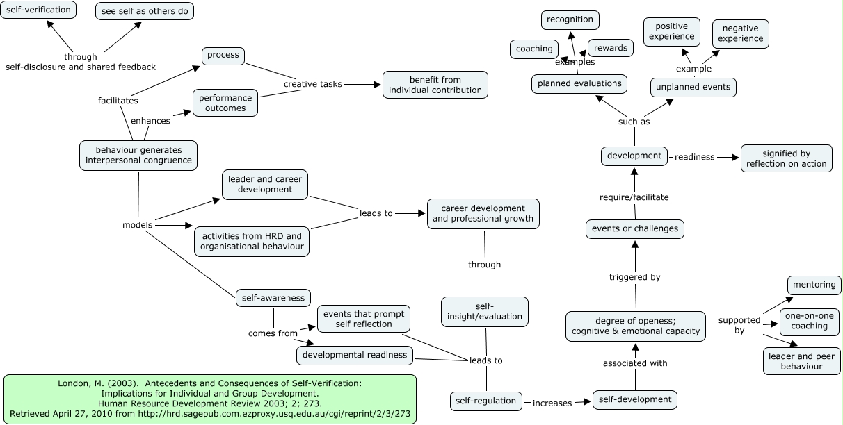 This Concept Map, created with IHMC CmapTools, has information related to: London on self-verification, activities from HRD and organisational behaviour leads to career development and professional growth, events or challenges require/facilitate development, planned evaluations examples recognition, degree of openess; cognitive & emotional capacity supported by mentoring, unplanned events example negative experience, degree of openess; cognitive & emotional capacity supported by leader and peer behaviour, self- insight/evaluation leads to self-regulation, developmental readiness leads to self-regulation, behaviour generates interpersonal congruence models leader and career development, development such as planned evaluations, self-awareness comes from events that prompt self reflection, performance outcomes creative tasks benefit from individual contribution, development such as unplanned events, career development and professional growth through self- insight/evaluation, self-awareness comes from developmental readiness, degree of openess; cognitive & emotional capacity triggered by events or challenges, events that prompt self reflection leads to self-regulation, process creative tasks benefit from individual contribution, leader and career development leads to career development and professional growth, planned evaluations examples rewards