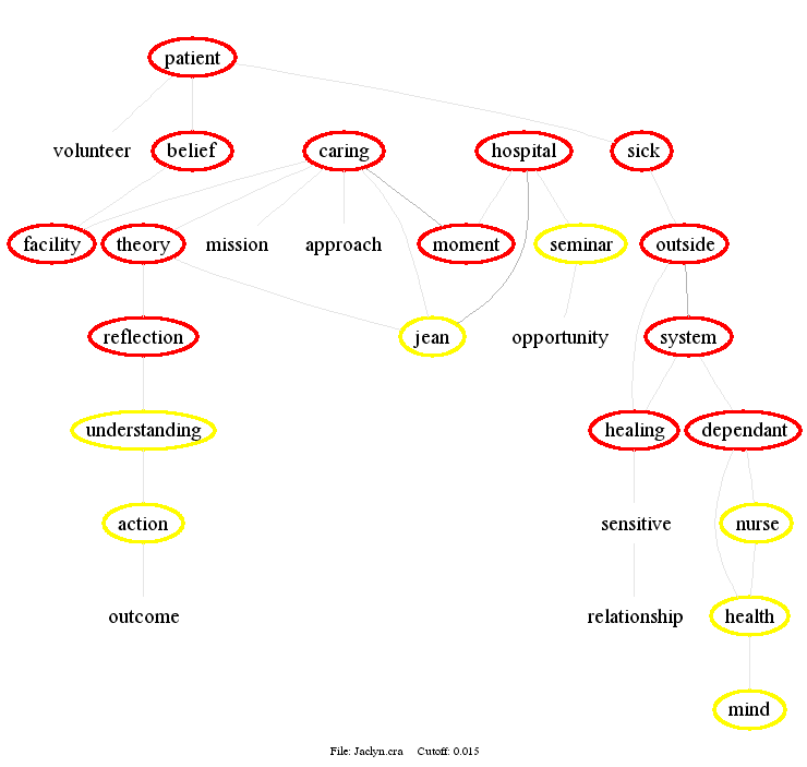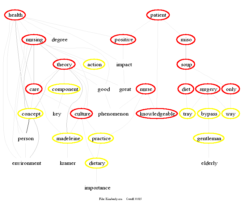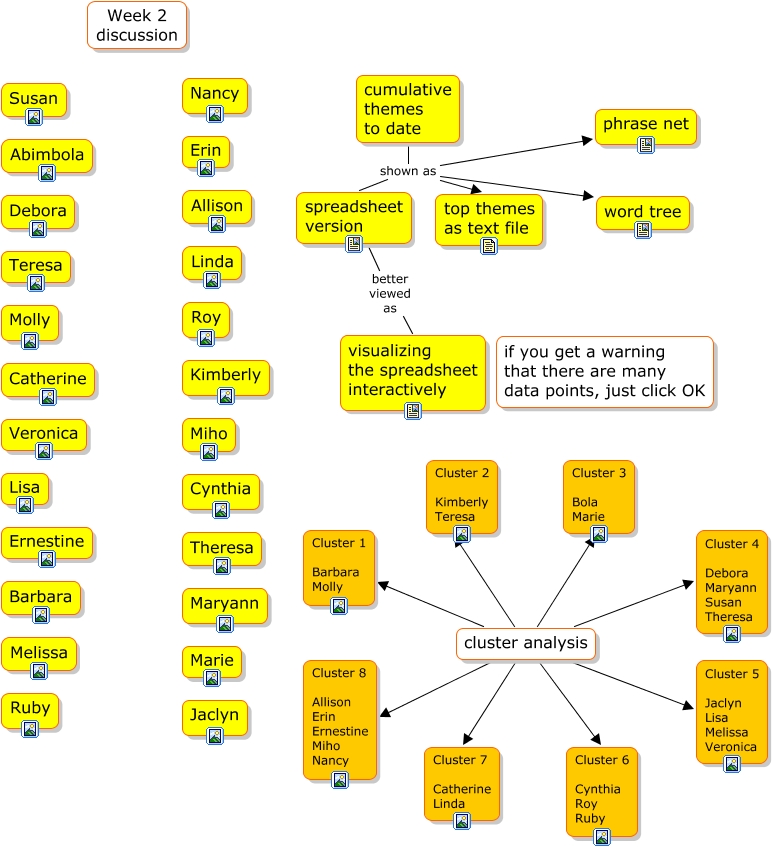 This Concept Map, created with IHMC CmapTools, has information related to: week 2, cluster analysis Cluster 2 Kimberly Teresa, cluster analysis Cluster 4 Debora Maryann Susan Theresa, cluster analysis Cluster 5 Jaclyn Lisa Melissa Veronica, cumulative themes to date shown as spreadsheet version, spreadsheet version better viewed as visualizing the spreadsheet interactively, cumulative themes to date shown as word tree, cluster analysis Cluster 6 Cynthia Roy Ruby, cluster analysis Cluster 7 Catherine Linda, cluster analysis Cluster 1 Barbara Molly, cumulative themes to date shown as phrase net, cluster analysis Cluster 8 Allison Erin Ernestine Miho Nancy, cluster analysis Cluster 3 Bola Marie, cumulative themes to date shown as top themes as text file