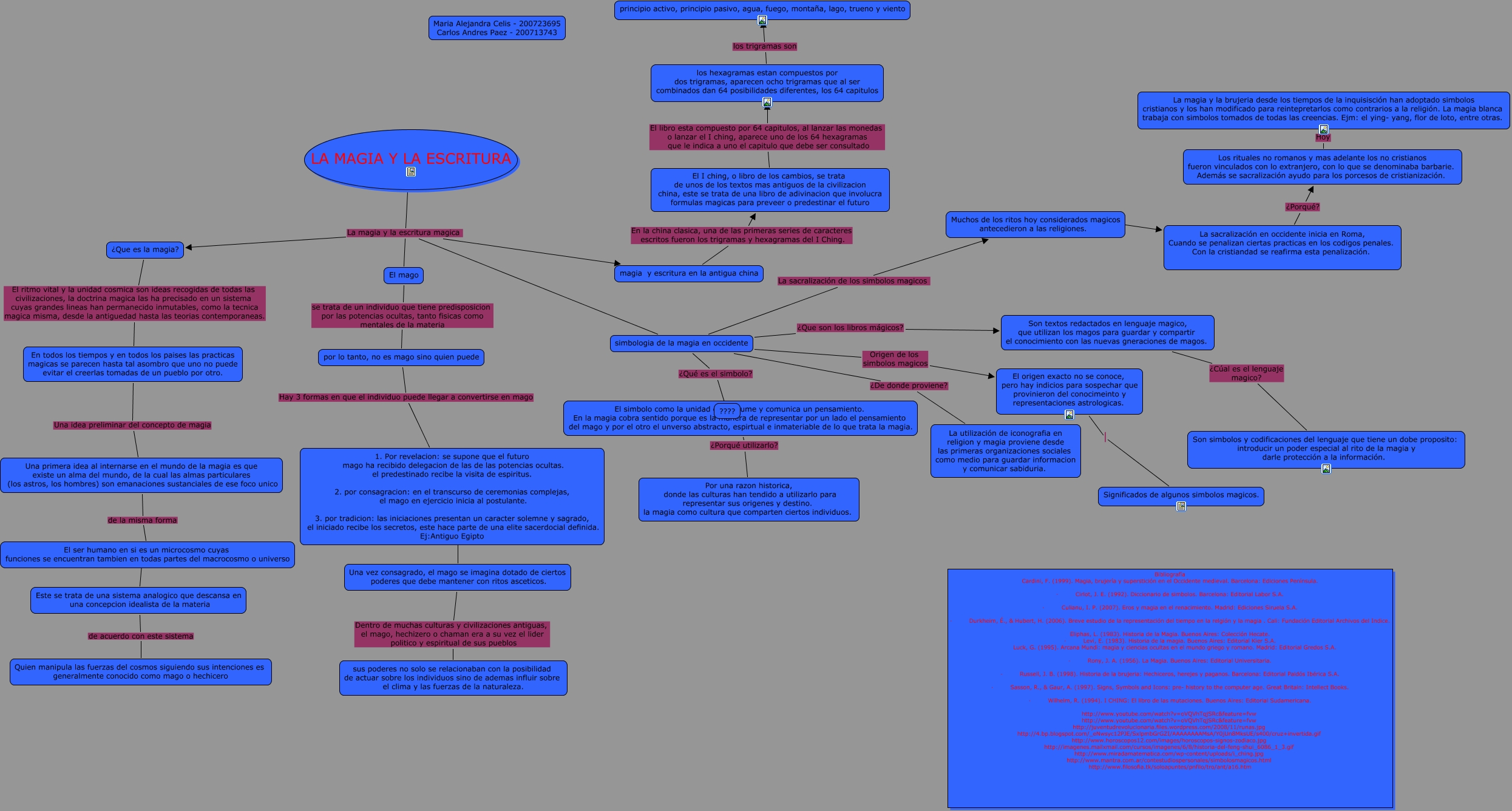 Este Cmap, tiene información relacionada con: La magia y la escritura magica, simbologia de la magia en occidente ¿Que son los libros mágicos? Son textos redactados en lenguaje magico, que utilizan los magos para guardar y compartir el conocimiento con las nuevas gneraciones de magos., Los rituales no romanos y mas adelante los no cristianos fueron vinculados con lo extranjero, con lo que se denominaba barbarie. Además se sacralización ayudo para los porcesos de cristianización. Hoy La magia y la brujeria desde los tiempos de la inquisisción han adoptado simbolos cristianos y los han modificado para reintepretarlos como contrarios a la religión. La magia blanca trabaja con simbolos tomados de todas las creencias. Ejm: el ying- yang, flor de loto, entre otras., El origen exacto no se conoce, pero hay indicios para sospechar que provinieron del conocimeinto y representaciones astrologicas. Significados de algunos simbolos magicos., Muchos de los ritos hoy considerados magicos antecedieron a las religiones. ???? La sacralización en occidente inicia en Roma, Cuando se penalizan ciertas practicas en los codigos penales. Con la cristiandad se reafirma esta penalización., El I ching, o libro de los cambios, se trata de unos de los textos mas antiguos de la civilizacion china, este se trata de una libro de adivinacion que involucra formulas magicas para preveer o predestinar el futuro El libro esta compuesto por 64 capitulos, al lanzar las monedas o lanzar el I ching, aparece uno de los 64 hexagramas que le indica a uno el capitulo que debe ser consultado los hexagramas estan compuestos por dos trigramas, aparecen ocho trigramas que al ser combinados dan 64 posibilidades diferentes, los 64 capitulos, simbologia de la magia en occidente Origen de los simbolos magicos El origen exacto no se conoce, pero hay indicios para sospechar que provinieron del conocimeinto y representaciones astrologicas., Una primera idea al internarse en el mundo de la magia es que existe un alma del mundo, de la cual las almas particulares (los astros, los hombres) son emanaciones sustanciales de ese foco unico de la misma forma El ser humano en si es un microcosmo cuyas funciones se encuentran tambien en todas partes del macrocosmo o universo, simbologia de la magia en occidente ¿Qué es el simbolo? ????, El ser humano en si es un microcosmo cuyas funciones se encuentran tambien en todas partes del macrocosmo o universo ???? Este se trata de una sistema analogico que descansa en una concepcion idealista de la materia, El mago se trata de un individuo que tiene predisposicion por las potencias ocultas, tanto fisicas como mentales de la materia por lo tanto, no es mago sino quien puede, los hexagramas estan compuestos por dos trigramas, aparecen ocho trigramas que al ser combinados dan 64 posibilidades diferentes, los 64 capitulos los trigramas son principio activo, principio pasivo, agua, fuego, montaña, lago, trueno y viento, 1. Por revelacion: se supone que el futuro mago ha recibido delegacion de las de las potencias ocultas. el predestinado recibe la visita de espiritus. 2. por consagracion: en el transcurso de ceremonias complejas, el mago en ejercicio inicia al postulante. 3. por tradicion: las iniciaciones presentan un caracter solemne y sagrado, el iniciado recibe los secretos, este hace parte de una elite sacerdocial definida. Ej:Antiguo Egipto ???? Una vez consagrado, el mago se imagina dotado de ciertos poderes que debe mantener con ritos asceticos., simbologia de la magia en occidente ¿De donde proviene? La utilización de iconografia en religion y magia proviene desde las primeras organizaciones sociales como medio para guardar informacion y comunicar sabiduria., Una vez consagrado, el mago se imagina dotado de ciertos poderes que debe mantener con ritos asceticos. Dentro de muchas culturas y civilizaciones antiguas, el mago, hechizero o chaman era a su vez el lider politico y espiritual de sus pueblos sus poderes no solo se relacionaban con la posibilidad de actuar sobre los individuos sino de ademas influir sobre el clima y las fuerzas de la naturaleza., LA MAGIA Y LA ESCRITURA La magia y la escritura magica El mago, LA MAGIA Y LA ESCRITURA La magia y la escritura magica ¿Que es la magia?, LA MAGIA Y LA ESCRITURA La magia y la escritura magica simbologia de la magia en occidente, Este se trata de una sistema analogico que descansa en una concepcion idealista de la materia de acuerdo con este sistema Quien manipula las fuerzas del cosmos siguiendo sus intenciones es generalmente conocido como mago o hechicero, En todos los tiempos y en todos los paises las practicas magicas se parecen hasta tal asombro que uno no puede evitar el creerlas tomadas de un pueblo por otro. Una idea preliminar del concepto de magia Una primera idea al internarse en el mundo de la magia es que existe un alma del mundo, de la cual las almas particulares (los astros, los hombres) son emanaciones sustanciales de ese foco unico, ¿Que es la magia? El ritmo vital y la unidad cosmica son ideas recogidas de todas las civilizaciones, la doctrina magica las ha precisado en un sistema cuyas grandes lineas han permanecido inmutables, como la tecnica magica misma, desde la antiguedad hasta las teorias contemporaneas. En todos los tiempos y en todos los paises las practicas magicas se parecen hasta tal asombro que uno no puede evitar el creerlas tomadas de un pueblo por otro.