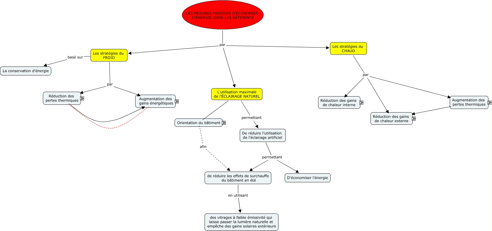 Cette carte de concepts créée avec IHMC CmapTools traite de: Stratégies passives, L'architecture du bâtiment par un design compact, L'architecture du bâtiment par une forme simple, une isolation importante pour limiter les exfiltrations et infiltrations, Sur l'orientation des fenestrations du bâtiment Soit Privilégier des ouvertures au sud afin de capter un maximum de lumière, La combinaison de différents matériaux d'isolants afin de Réduire voire éliminer les ponts thermiques, LES MESURES PASSIVES D'ÉCONOMIES D'ÉNERGIE DANS LES BÂTIMENTS par Les stratégies du CHAUD, le captage d'un maximum d'énergie solaire par Lumière naturelle, En évitant les ouvertures à l'ouest/est sinon, avec protection solaire verticale rétractable Ce qui favorise L'éfficacité énergétique, ventilation soit en effet cheminé, l'utilisation maximale de l'éclairage naturel en privilégiant les vitrages à faible émissivité avec un revêtement spectralement sélectif, Une bonne isolation thermique Ce qui favorise L'éfficacité énergétique, le captage d'un maximum d'énergie solaire suivi du stockage et la restitution de l'énergie, Isolation extérieure assurant Distribution intérieure de l'énergie, ventilation qui favorise le confort thermique, Réduction des gains de chaleur interne par une disposition intelligente des différentes pièces du bâtiment, Les stratégies du FROID par La réduction des pertes thermiques, stockage et la restitution de l'énergie par la maximisation de l'inertie thermique du bâtiment, limiter les exfiltrations et infiltrations avec Apport d'air neuf par un système de ventilation mécanique, l'enveloppe (murs, vitrage, etc..) influence L'architecture du bâtiment, une bonne isolation thermique pour limiter les exfiltrations et infiltrations