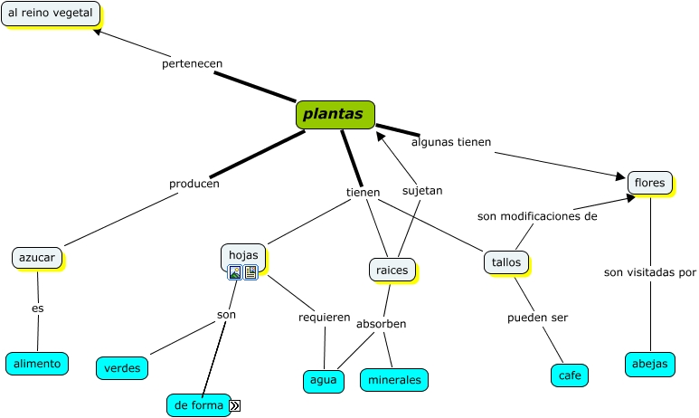 Este Cmap, tiene información relacionada con: plantas, tallos son modificaciones de flores, hojas requieren agua, plantas tienen hojas, hojas son redondas, raices sujetan plantas, raices absorben minerales, hojas son dentadas, hojas son acorazonadas, plantas algunas tienen flores, plantas pertenecen al reino vegetal, hojas son alargadas, tallos pueden ser cafe, plantas tienen tallos, raices absorben agua, plantas tienen raices, hojas son verdes, flores son visitadas por abejas, plantas producen azucar, azucar es alimento