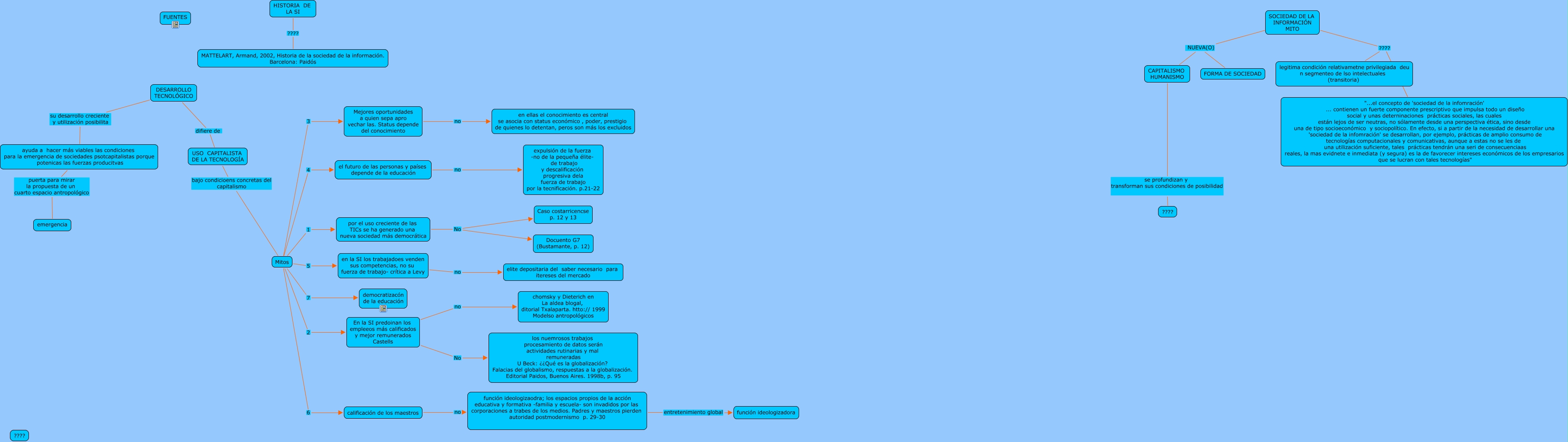 Este Cmap, tiene información relacionada con: Mito Sociedad de la información, Mitos 7 democratizacón de la educación, Mejores oportunidades a quien sepa apro vechar las. Status depende del conocimiento no en ellas el conocimiento es central se asocia con status económico , poder, prestigio de quienes lo detentan, peros son más los excluidos, el futuro de las personas y países depende de la educación no expulsión de la fuerza -no de la pequeña élite- de trabajo y descalificación progresiva dela fuerza de trabajo por la tecnificación. p.21-22, Mitos 2 En la SI predoinan los empleeos más calificados y mejor remunerados Castells, SOCIEDAD DE LA INFORMACIÓN MITO NUEVA(O) FORMA DE SOCIEDAD, Mitos 4 el futuro de las personas y países depende de la educación, DESARROLLO TECNOLÓGICO difiere de USO CAPITALISTA DE LA TECNOLOGÍA, por el uso creciente de las TICs se ha generado una nueva sociedad más democrática No Docuento G7 (Bustamante, p. 12), En la SI predoinan los empleeos más calificados y mejor remunerados Castells no chomsky y Dieterich en La aldea blogal, ditorial Txalaparta. htto:// 1999 Modelso antropológicos, Mitos 3 Mejores oportunidades a quien sepa apro vechar las. Status depende del conocimiento, CAPITALISMO HUMANISMO se profundizan y transforman sus condiciones de posibilidad ????, Mitos 1 por el uso creciente de las TICs se ha generado una nueva sociedad más democrática, SOCIEDAD DE LA INFORMACIÓN MITO NUEVA(O) CAPITALISMO HUMANISMO, SOCIEDAD DE LA INFORMACIÓN MITO ???? "...el concepto de 'sociedad de la infomración' ... contienen un fuerte componente prescriptivo que impulsa todo un diseño social y unas deterninaciones prácticas sociales, las cuales están lejos de ser neutras, no sólamente desde una perspectiva ética, sino desde una de tipo socioeconómico y sociopolítico. En efecto, si a partir de la necesidad de desarrollar una 'sociedad de la infomración' se desarrollan, por ejemplo, prácticas de amplio consumo de tecnologías computacionales y comunicativas, aunque a estas no se les de una utilización suficiente, tales prácticas tendrán una seri de consecuenciaas reales, la mas evidnete e inmediata (y segura) es la de favorecer intereses económicos de los empresarios que se lucran con tales tecnologías", en la SI los trabajadoes venden sus competencias, no su fuerza de trabajo- crítica a Levy no elite depositaria del saber necesario para itereses del mercado, Mitos 6 calificación de los maestros, SOCIEDAD DE LA INFORMACIÓN MITO ???? legitima condición relativametne privilegiada deu n segmenteo de lso intelectuales (transitoria), Mitos 5 en la SI los trabajadoes venden sus competencias, no su fuerza de trabajo- crítica a Levy, USO CAPITALISTA DE LA TECNOLOGÍA bajo condicioens concretas del capitalismo Mitos, HISTORIA DE LA SI ???? MATTELART, Armand, 2002, Historia de la sociedad de la información. Barcelona: Paidós