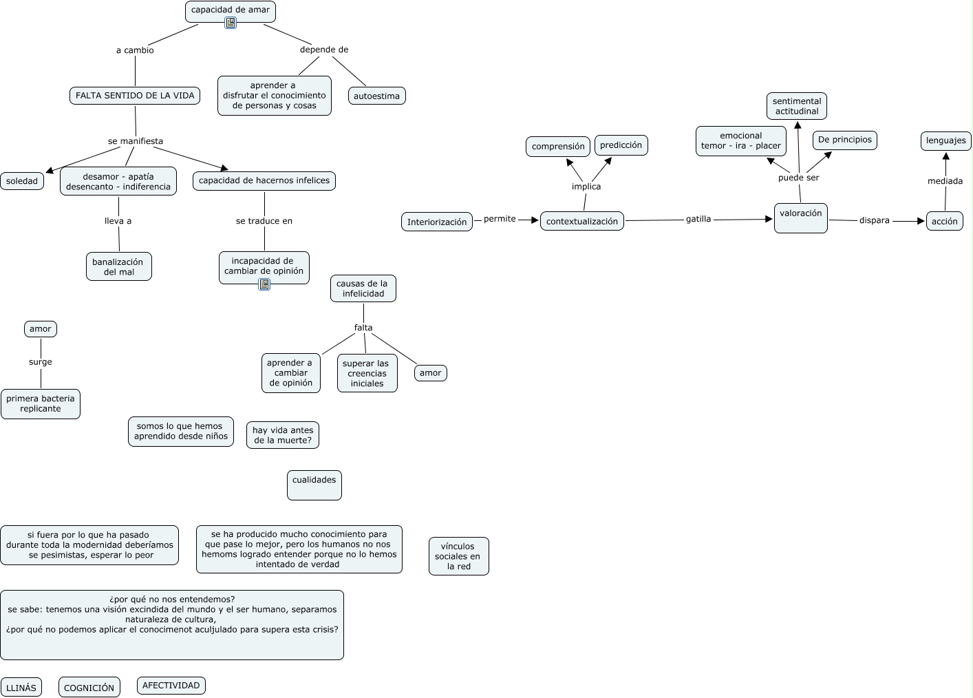 Este Cmap, tiene información relacionada con: NACER PARA SEMILLA 2, contextualización implica predicción, valoración dispara acción, causas de la infelicidad falta aprender a cambiar de opinión, valoración puede ser sentimental actitudinal, acción mediada lenguajes, Interiorización permite contextualización, valoración puede ser De principios, FALTA SENTIDO DE LA VIDA se manifiesta capacidad de hacernos infelices, FALTA SENTIDO DE LA VIDA se manifiesta soledad, FALTA SENTIDO DE LA VIDA se manifiesta desamor - apatía desencanto - indiferencia, capacidad de amar a cambio FALTA SENTIDO DE LA VIDA, capacidad de amar depende de autoestima, valoración puede ser emocional temor - ira - placer, contextualización implica comprensión, desamor - apatía desencanto - indiferencia lleva a banalización del mal, contextualización gatilla valoración, capacidad de amar depende de aprender a disfrutar el conocimiento de personas y cosas, causas de la infelicidad falta superar las creencias iniciales, capacidad de hacernos infelices se traduce en incapacidad de cambiar de opinión, causas de la infelicidad falta amor