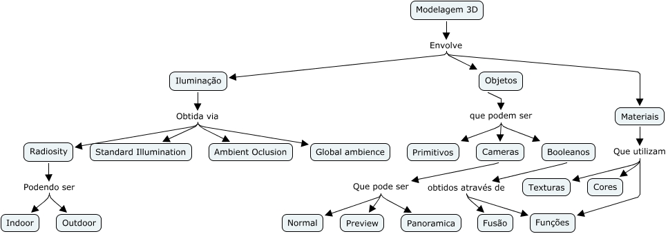 Esse mapa conceitual, produzido no IHMC CmapTools, tem a informação relacionada a: Sem título 2, Iluminação Obtida via Ambient Oclusion, Cameras Que pode ser Normal, Modelagem 3D Envolve Objetos, Booleanos obtidos através de Funções, Materiais Que utilizam Texturas, Materiais Que utilizam Funções, Radiosity Podendo ser Indoor, Iluminação Obtida via Radiosity, Cameras Que pode ser Preview, Iluminação Obtida via Global ambience, Objetos que podem ser Booleanos, Iluminação Obtida via Standard Illumination, Modelagem 3D Envolve Materiais, Modelagem 3D Envolve Iluminação, Booleanos obtidos através de Fusão, Radiosity Podendo ser Outdoor, Materiais Que utilizam Cores, Cameras Que pode ser Panoramica, Objetos que podem ser Primitivos, Objetos que podem ser Cameras