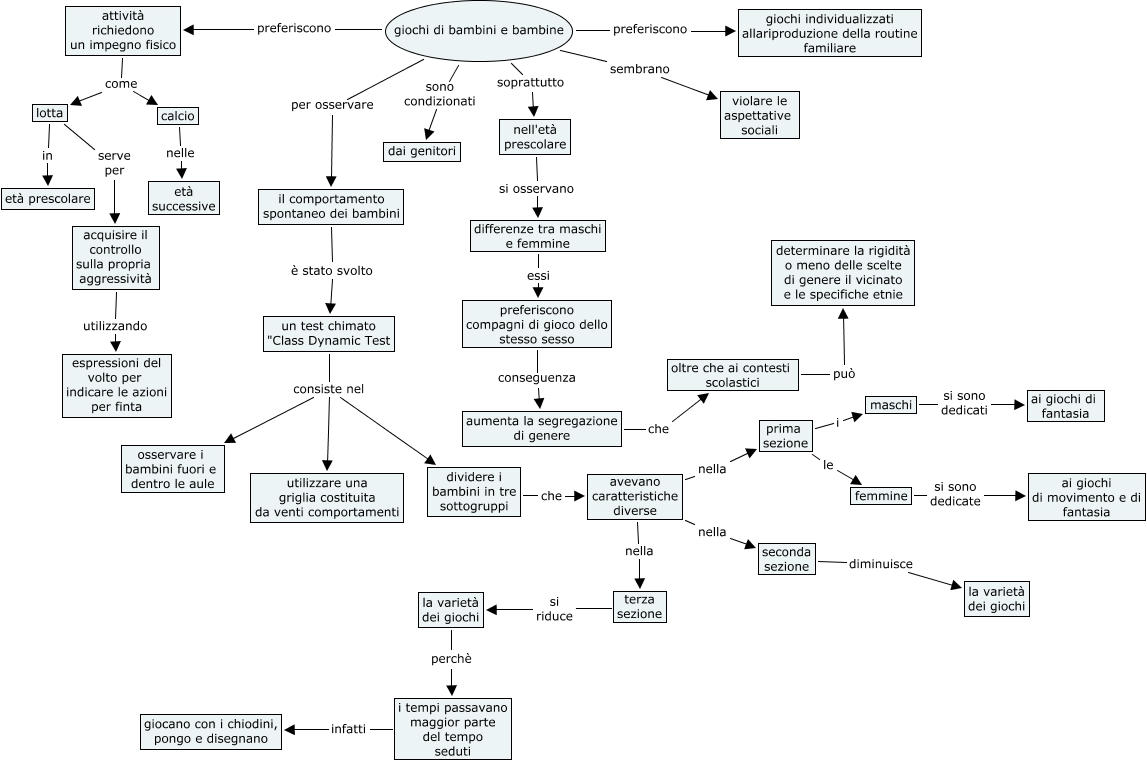 Questa Cmap, creata con IHMC CmapTools, contiene informazioni relative a: Senza titolo 1, giochi di bambini e bambine per osservare il comportamento spontaneo dei bambini, seconda sezione diminuisce la varietà dei giochi, oltre che ai contesti scolastici può determinare la rigidità o meno delle scelte di genere il vicinato e le specifiche etnie, giochi di bambini e bambine sembrano violare le aspettative sociali, calcio nelle età successive, lotta serve per acquisire il controllo sulla propria aggressività, prima sezione i maschi, il comportamento spontaneo dei bambini è stato svolto un test chimato "Class Dynamic Test, preferiscono compagni di gioco dello stesso sesso conseguenza aumenta la segregazione di genere, un test chimato "Class Dynamic Test consiste nel utilizzare una griglia costituita da venti comportamenti, aumenta la segregazione di genere che oltre che ai contesti scolastici, lotta in età prescolare, avevano caratteristiche diverse nella terza sezione, attività richiedono un impegno fisico come lotta, maschi si sono dedicati ai giochi di fantasia, un test chimato "Class Dynamic Test consiste nel osservare i bambini fuori e dentro le aule, giochi di bambini e bambine preferiscono attività richiedono un impegno fisico, la varietà dei giochi perchè i tempi passavano maggior parte del tempo seduti, prima sezione le femmine, femmine si sono dedicate ai giochi di movimento e di fantasia