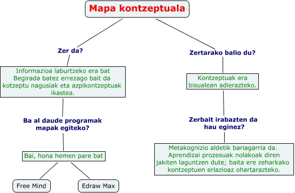 Este Cmap, tiene información relacionada con: Mapa kontzeptuala, Bai, hona hemen pare bat Free Mind, Informazioa laburtzeko era bat Begirada batez errezago bait da kotzeptu nagusiak eta azpikontzeptuak ikastea. Ba al daude programak mapak egiteko? Bai, hona hemen pare bat, Mapa kontzeptuala Zer da? Informazioa laburtzeko era bat Begirada batez errezago bait da kotzeptu nagusiak eta azpikontzeptuak ikastea., Kontzeptuak era bisualean adierazteko. Zerbait irabazten da hau eginez? Metakognizio aldetik bariagarria da. Aprendizai prozesuak nolakoak diren jakiten laguntzen dute; baita ere zeharkako kontzeptuen erlazioaz ohartarazteko., Bai, hona hemen pare bat Edraw Max, Mapa kontzeptuala Zertarako balio du? Kontzeptuak era bisualean adierazteko.