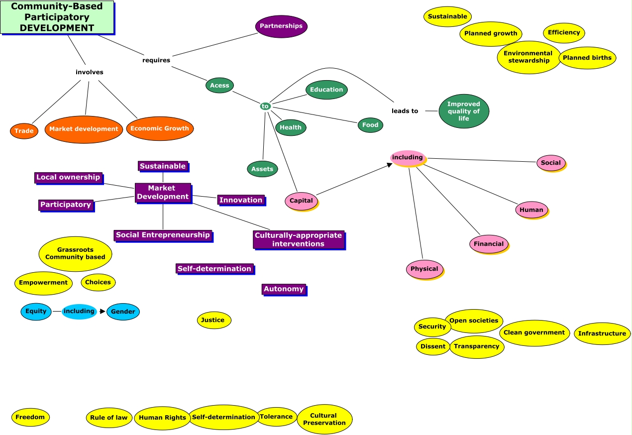 This Concept Map, created with IHMC CmapTools, has information related to: Development_Allison, Local ownership Market Development, Culturally-appropriate interventions Market Development, leads to to Health, Acess to Assets, Capital including Physical, Acess to Food, Community-Based Participatory DEVELOPMENT involves Trade, leads to to Capital, leads to to Education, Acess to Capital, leads to to Food, Market Development Innovation, Sustainable Market Development, Capital including Social, Market Development Social Entrepreneurship, Community-Based Participatory DEVELOPMENT involves Economic Growth, Community-Based Participatory DEVELOPMENT involves Market development, Equity including Gender, Capital including Human, Acess to Health