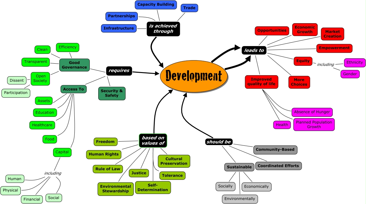 This Concept Map, created with IHMC CmapTools, has information related to: OFrey Development IS, Capital including Financial, requires Development, Health Improved quality of life, Participation Open Society, Clean Good Governance, Justice based on values of, leads to Opportunities, Ethnicity including Gender, Capital including Physical, Coordinated Efforts should be Development, Economic Growth leads to, Sustainable should be Development, Self- Determination based on values of, Planned Population Growth Improved quality of life, Sustainable should be Community-Based, Capital including Human, Development leads to, is achieved through Development, Rule of Law based on values of, Equity leads to