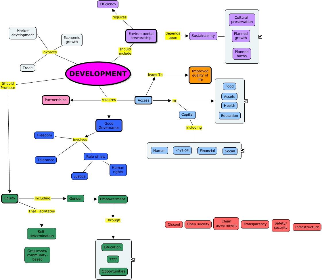 This Concept Map, created with IHMC CmapTools, has information related to: Table-of-seven, DEVELOPMENT involves Market development, Gender Empowerment, Access to Capital, Empowerment Through ????, Access leads To Improved quality of life, DEVELOPMENT Should Promote Equity, Access requires DEVELOPMENT, DEVELOPMENT involves Economic growth, Access requires Partnerships, Environmental stewardship requires Efficiency, Capital including ????, Equity including Gender, Good Governance involves Rule of law, Equity That Facilitates Self- determination, Rule of law Human rights, DEVELOPMENT involves Trade, Sustainability ????, Access requires Good Governance, Access to ????, DEVELOPMENT should include Environmental stewardship